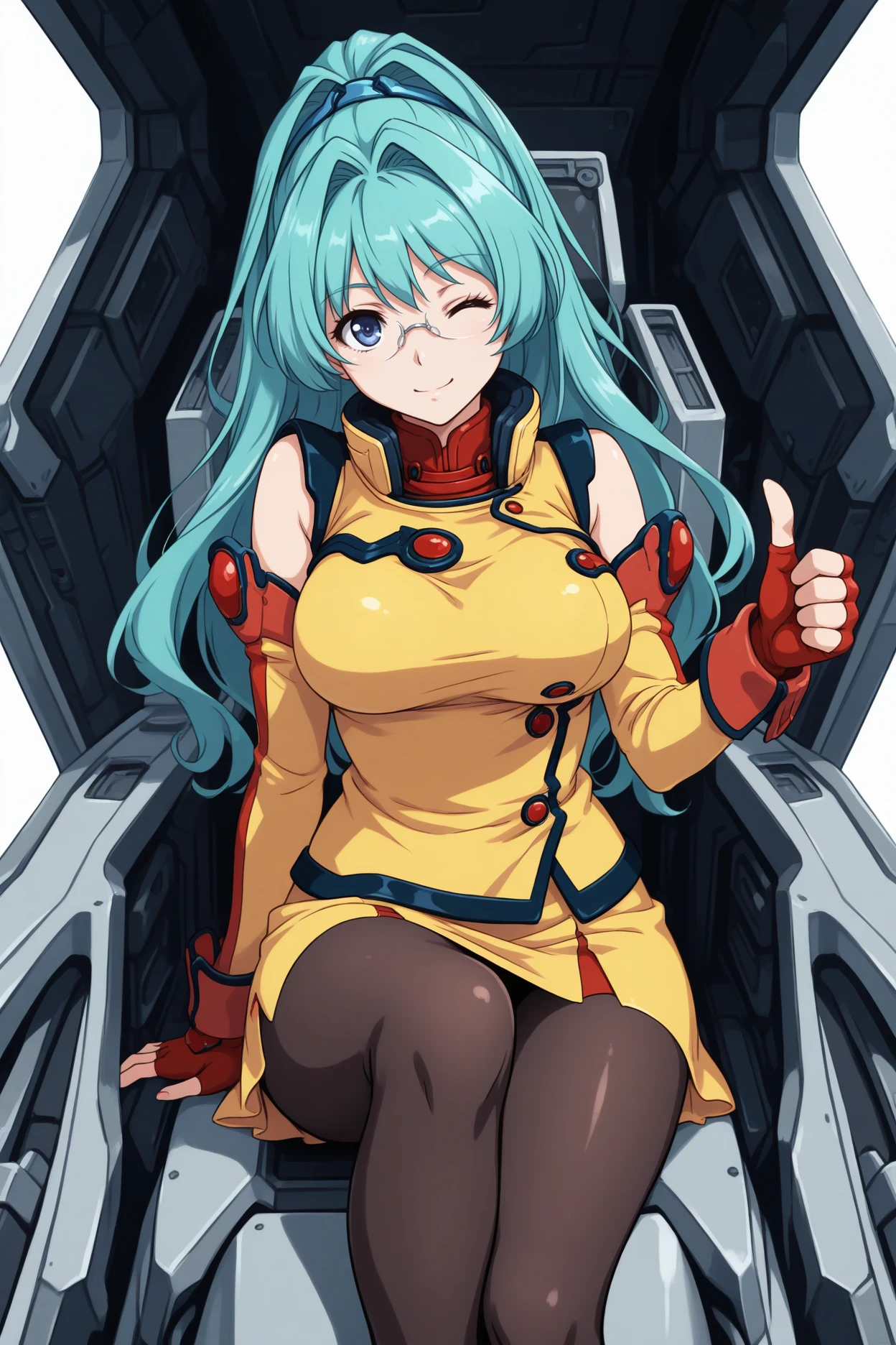 Add "glasses, turtleneck, yellow uniform, sleeveless shirt, yellow skirt, red gloves, fingerless gloves, detached sleeves, black pantyhose" for her typical look.
