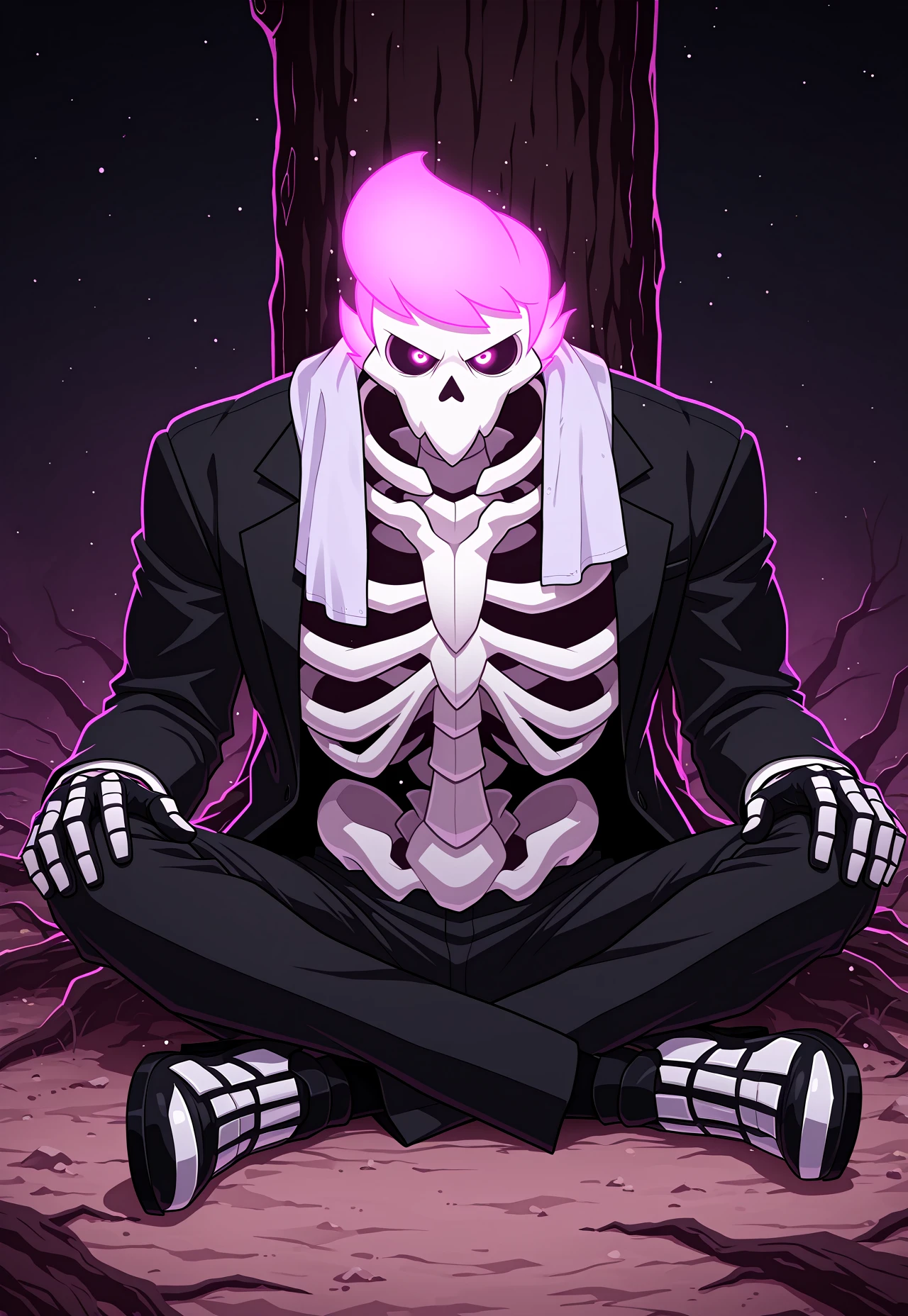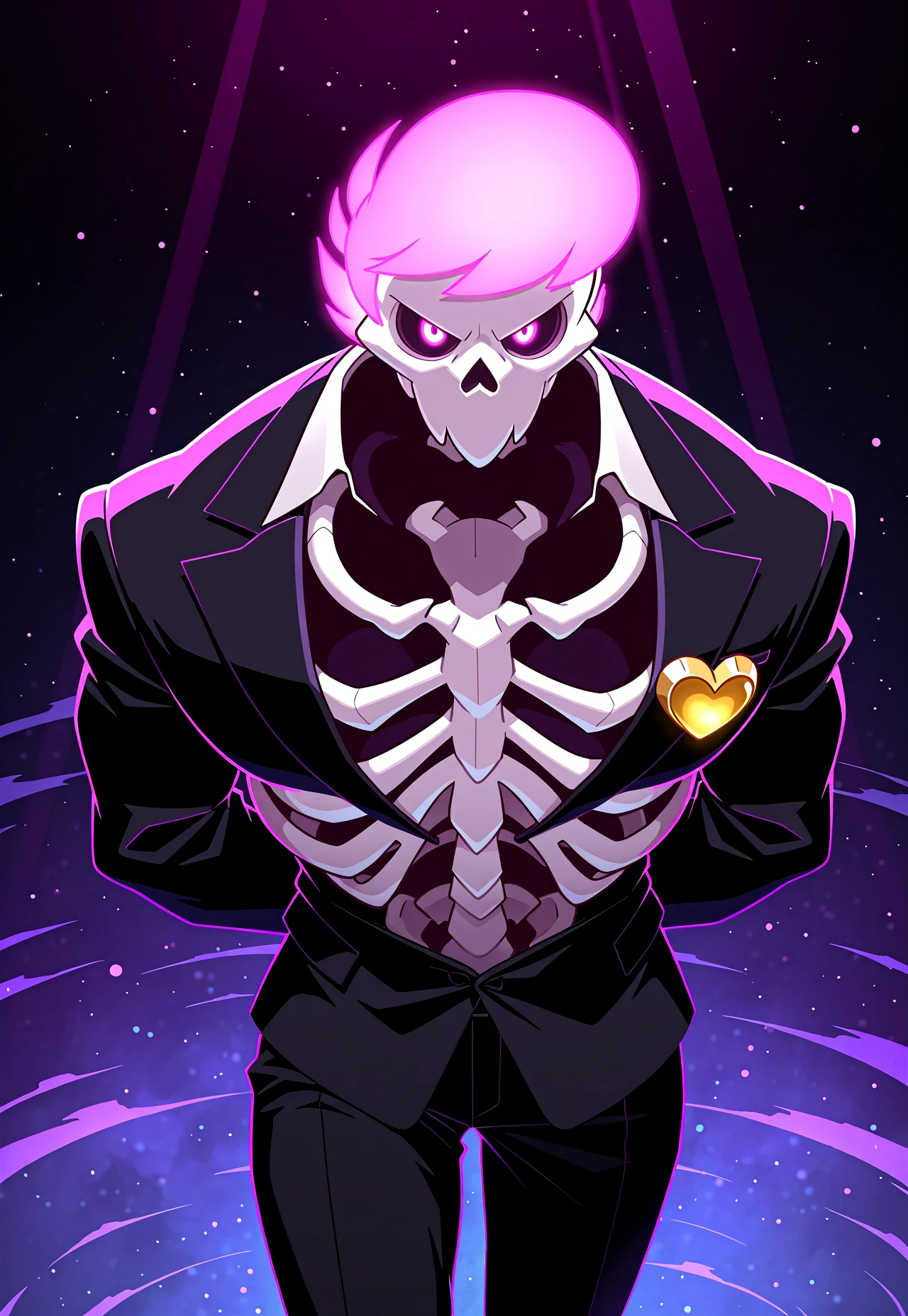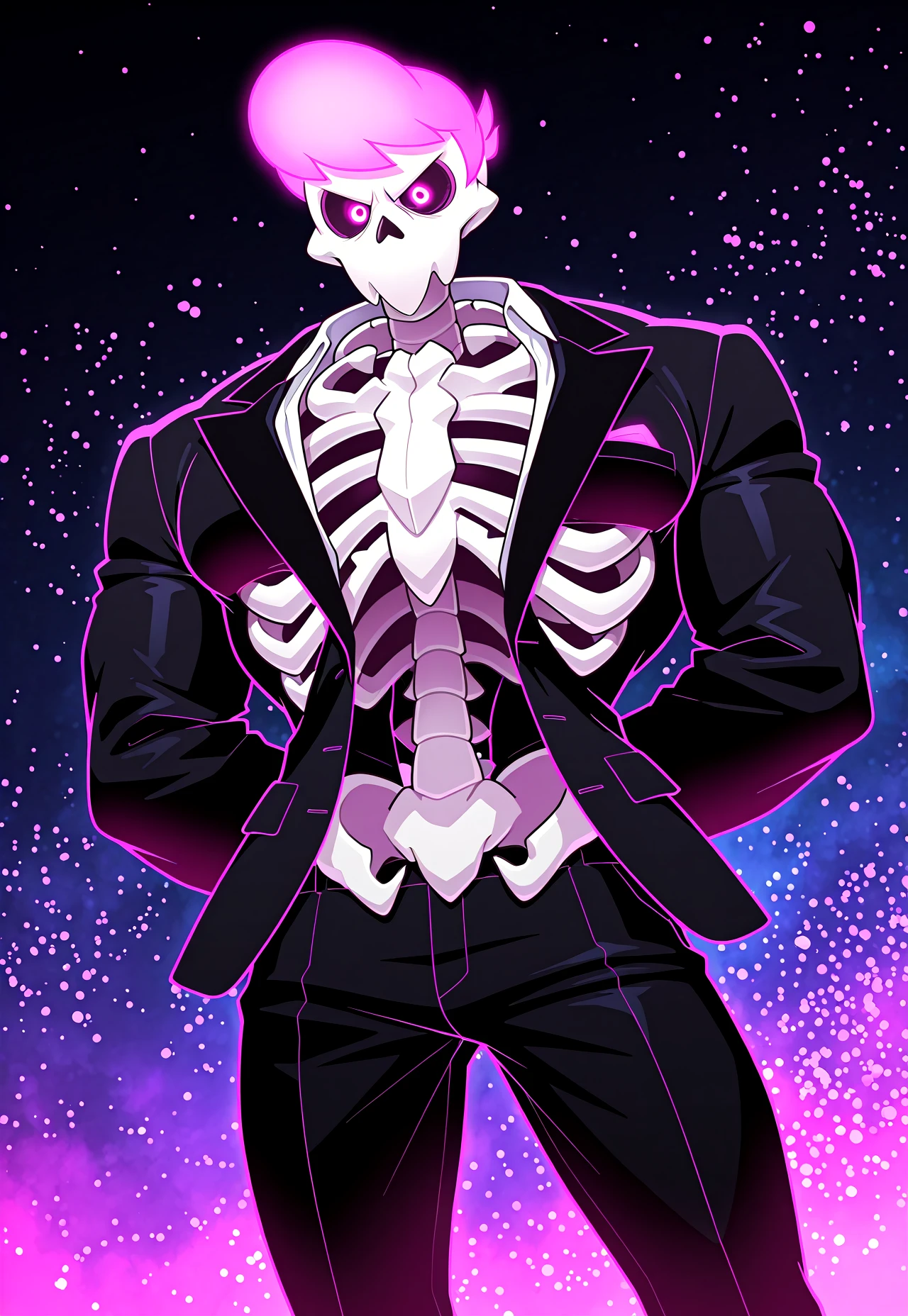 ((Skeleton, Skeleton body):1.4), adult, manly, ,solo, bright vibrant pink hair, highlighted with glowing purple outlines, gloves, pink hairstyle, glowing hair, glowing eyes, black sclera, pink eyes, broad shoulders, Huge pectoral,