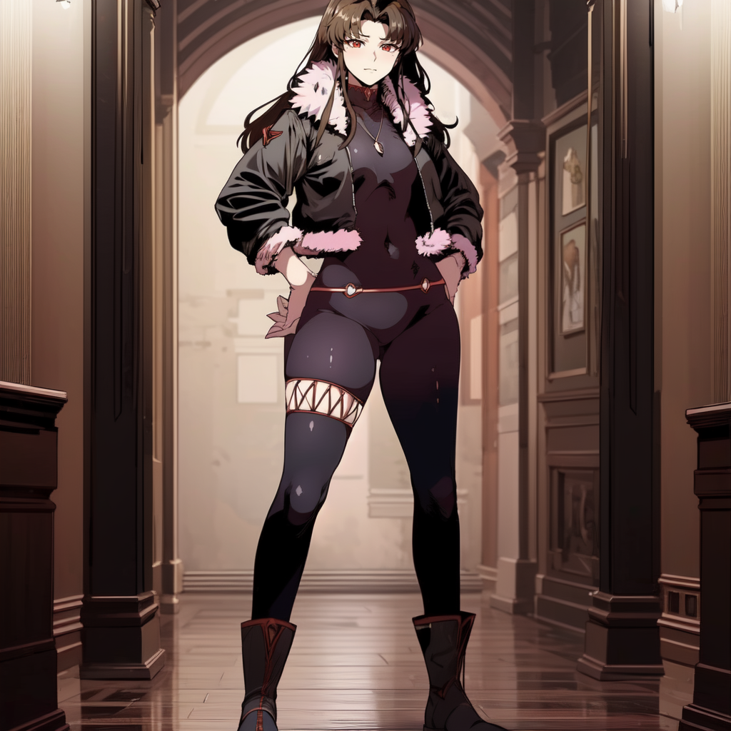 1girl, solo, long hair, brown hair, black hair, jewelry, standing, jacket, full body, boots, fur trim, bodysuit, covered navel, skin tight