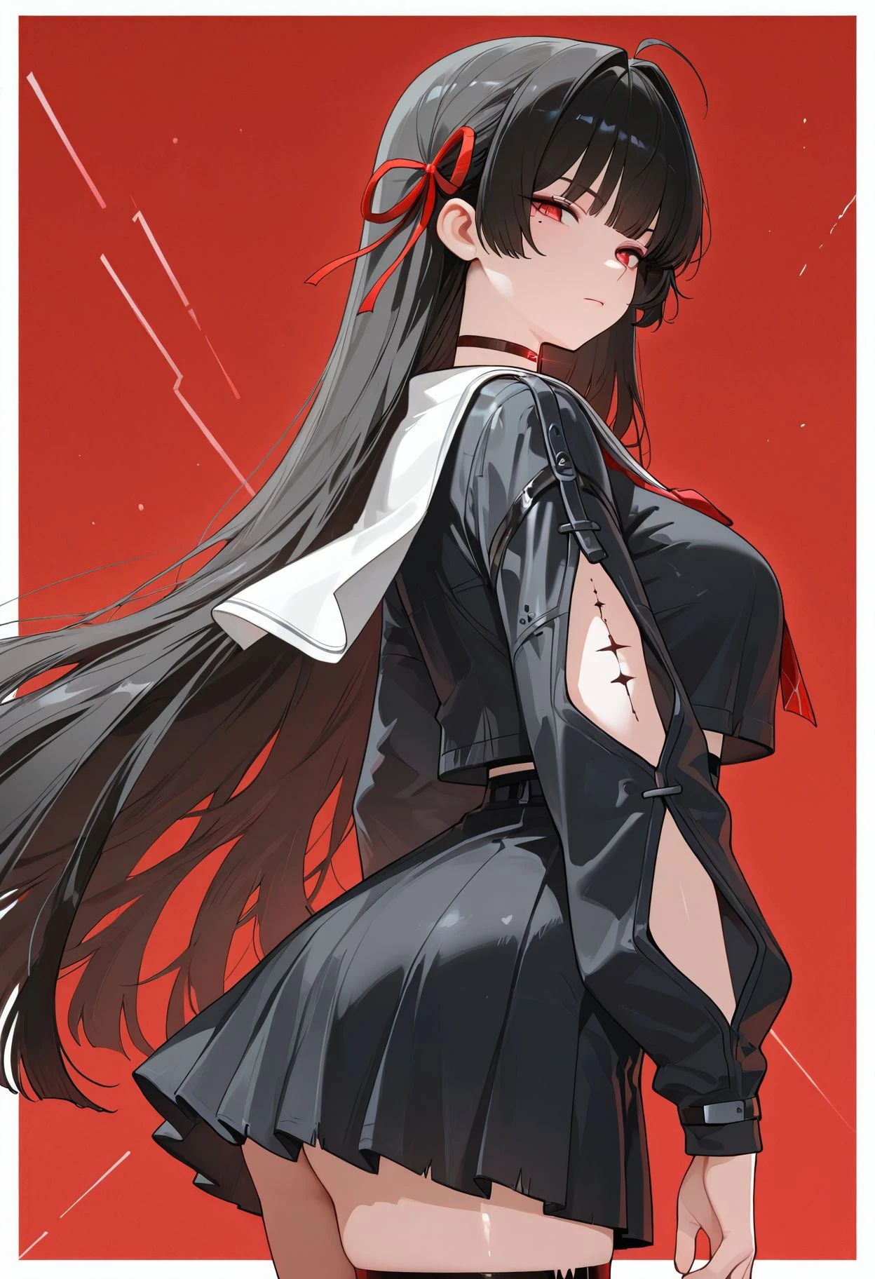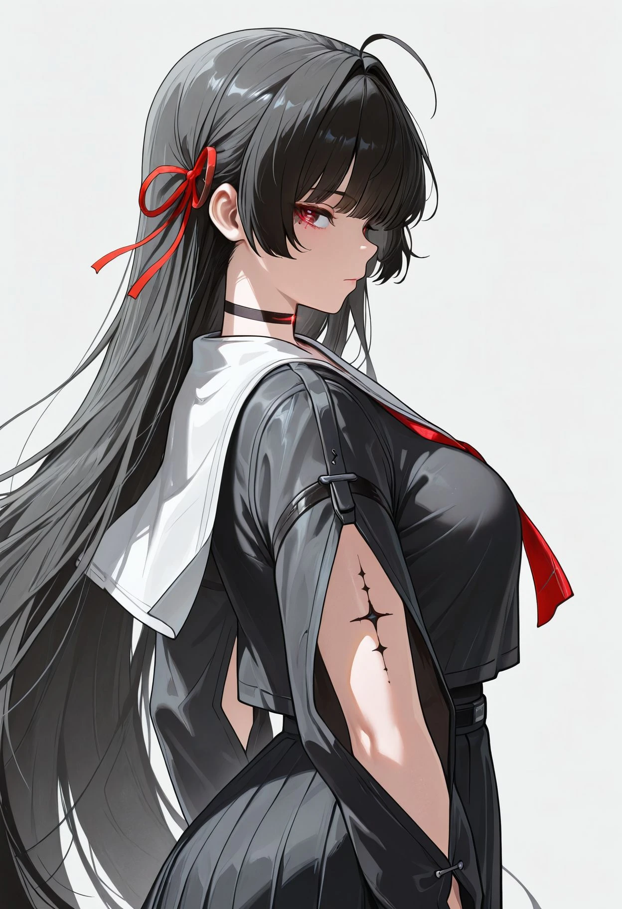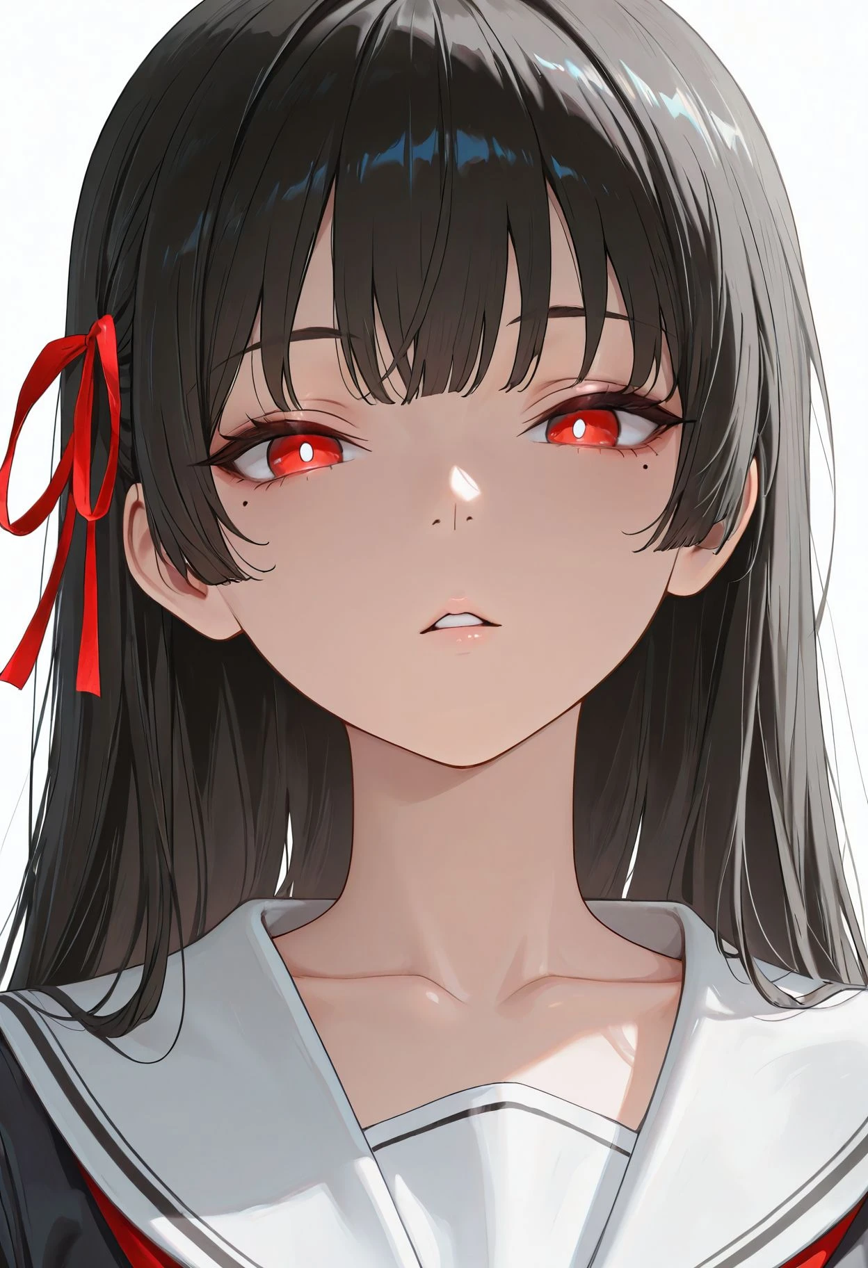 red eyes,black hair,long hair,hime cut,red ribbon