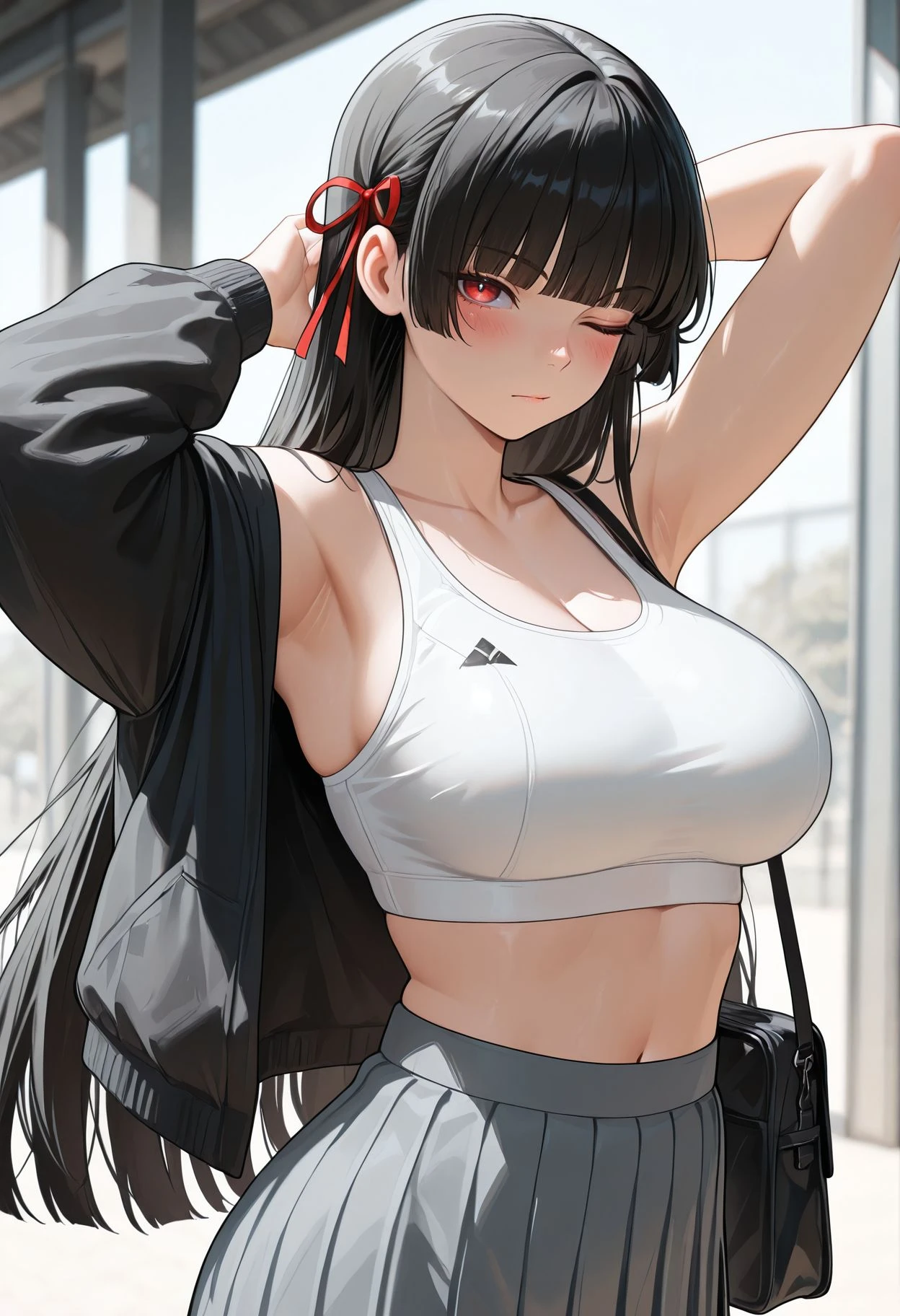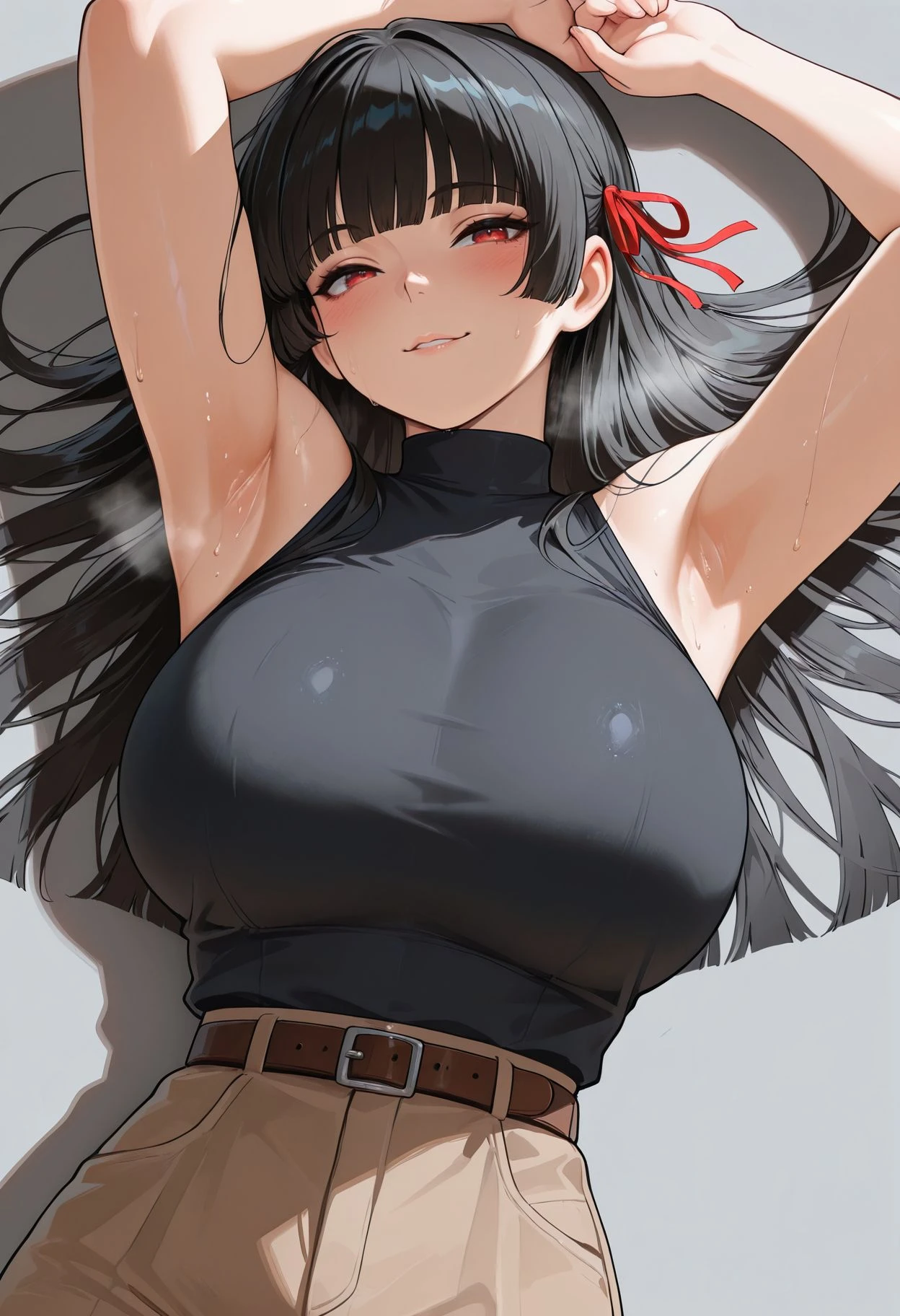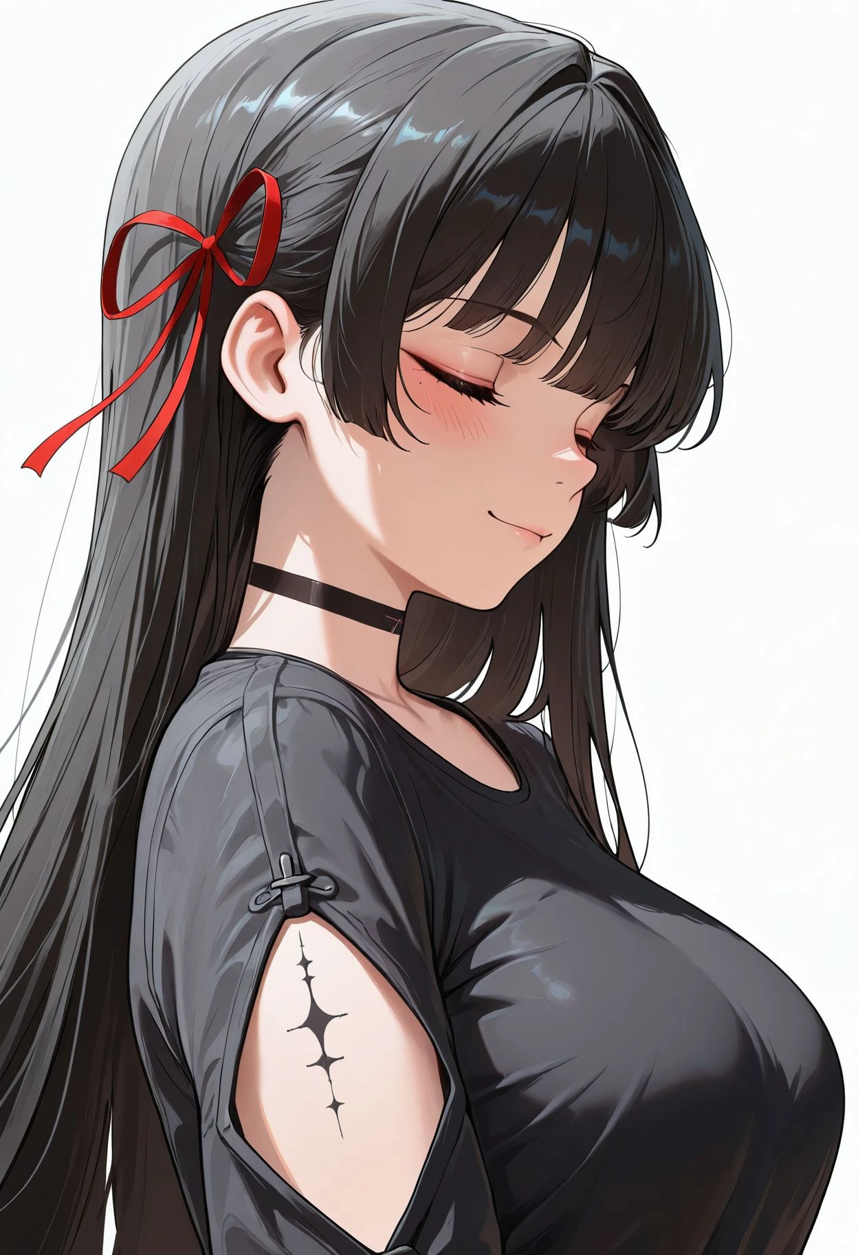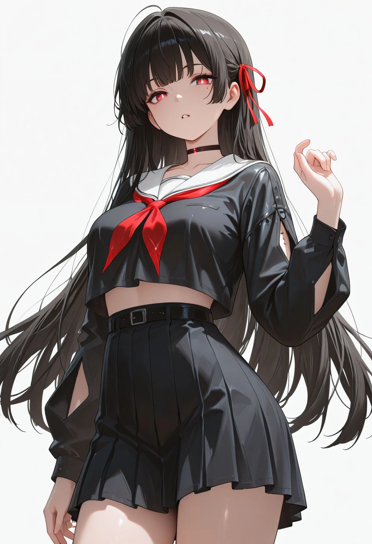 red eyes,black hair,long hair,hime cut,red ribbon
