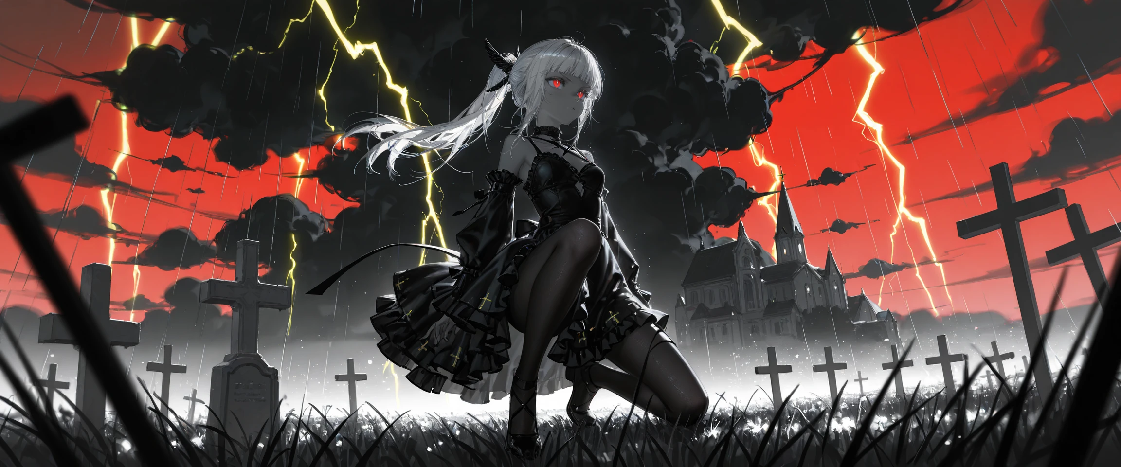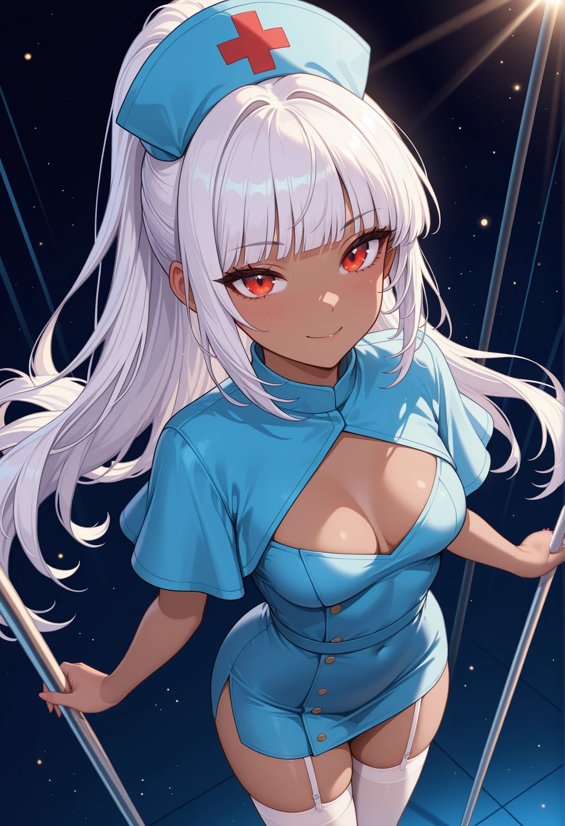 xiapila,blunt bangs,dark-skinned female,long hair,ponytail,red eyes,white hair,
