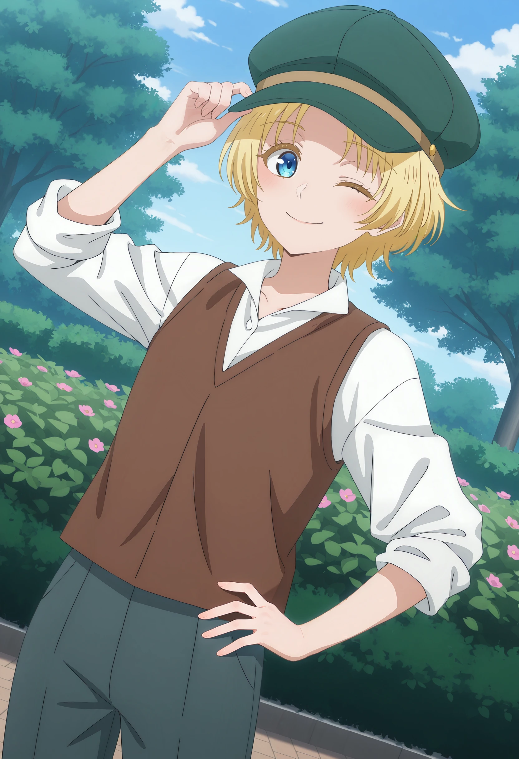 #2: green newsboy cap, brown sweater vest, white shirt, long sleeves, sleeves rolled up, grey pants, brown shoes, low block heels