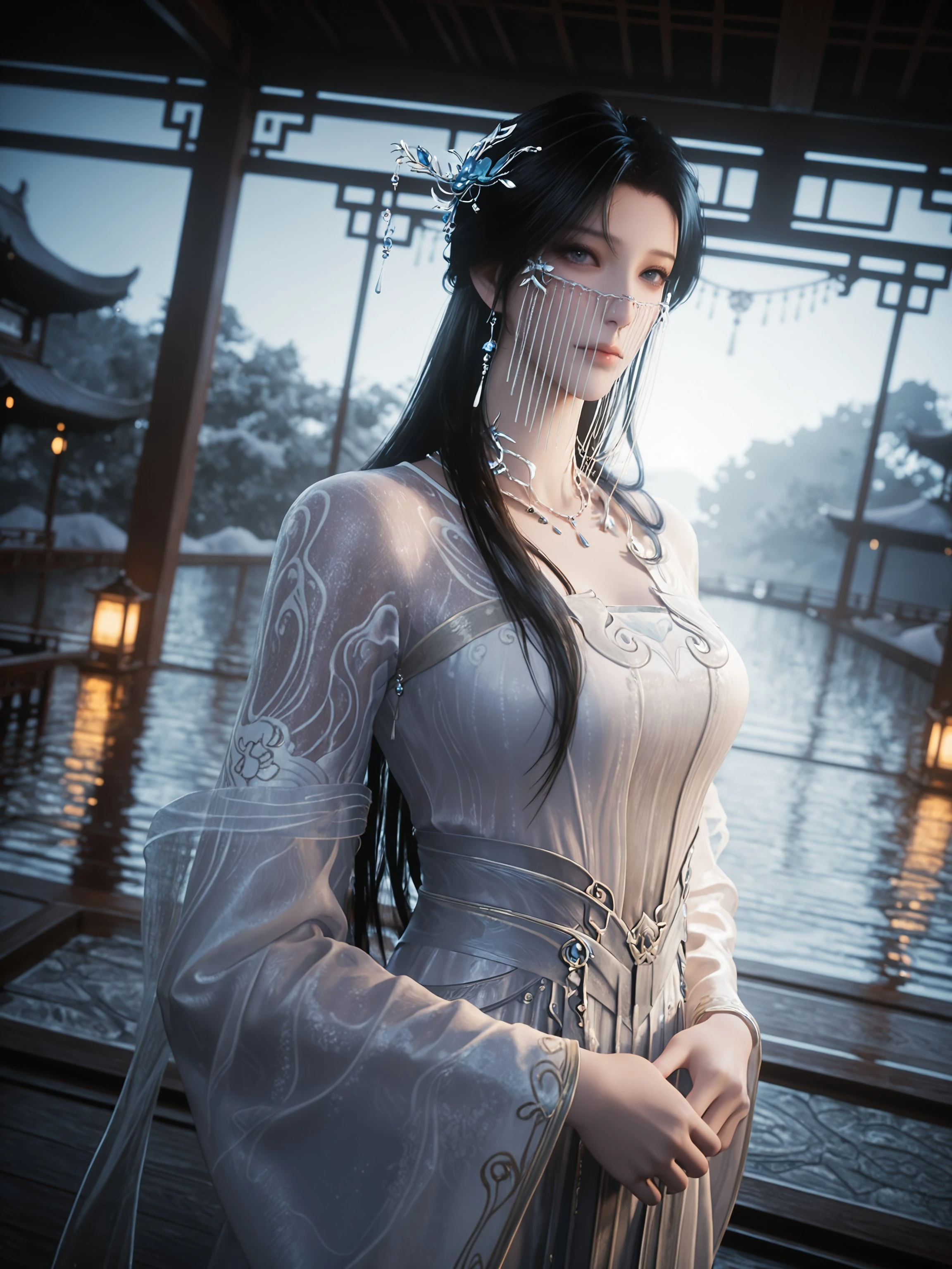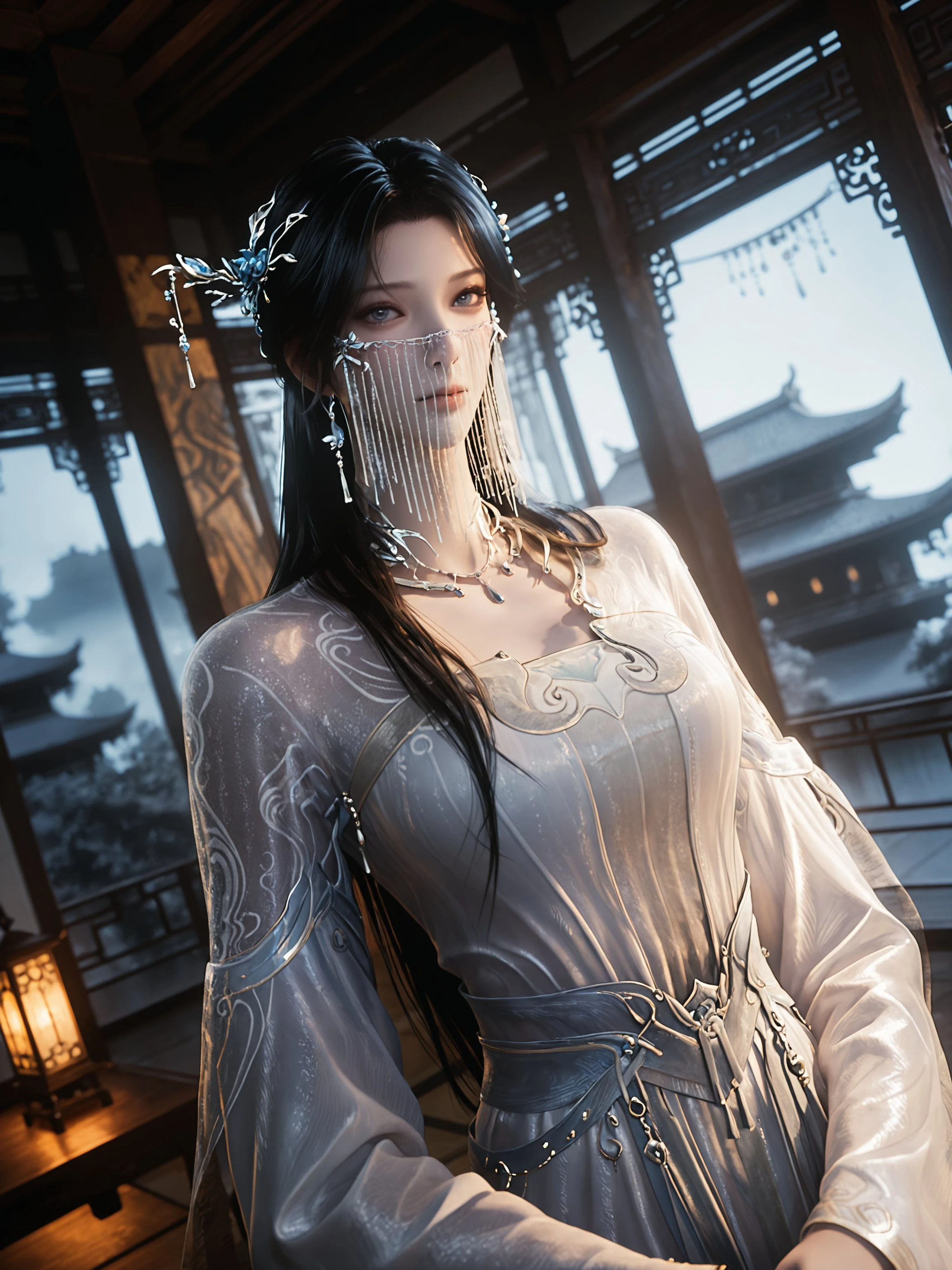 outsuit2,1girl,solo,black hair,dress,hair ornament,white dress,long hair,jewelry,necklace,blue eyes,sash,veil,closed mouth,upper body,long sleeves,