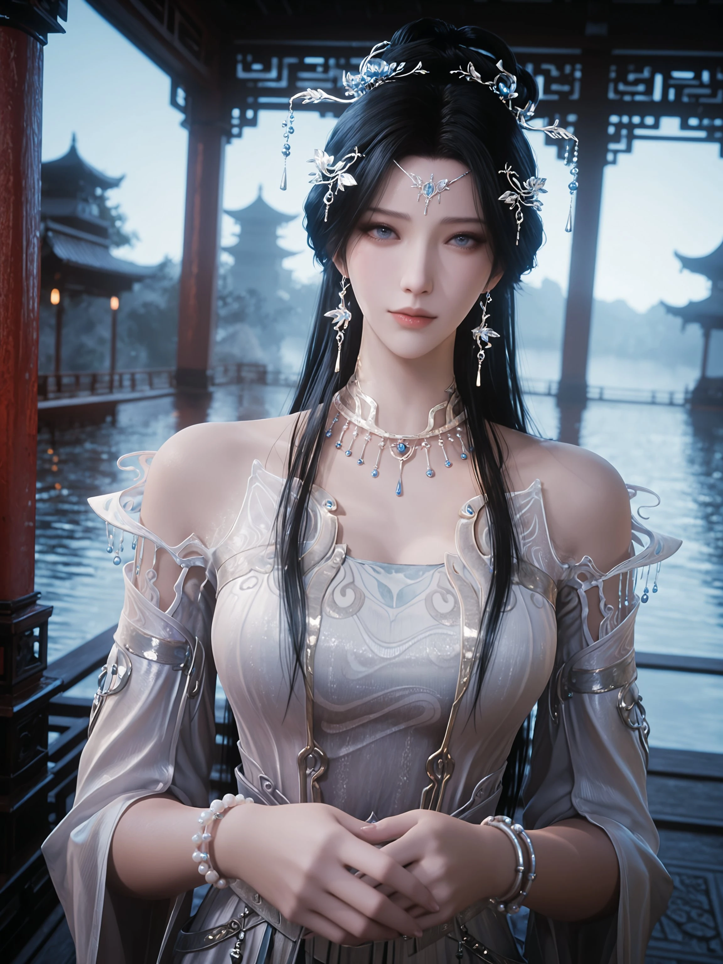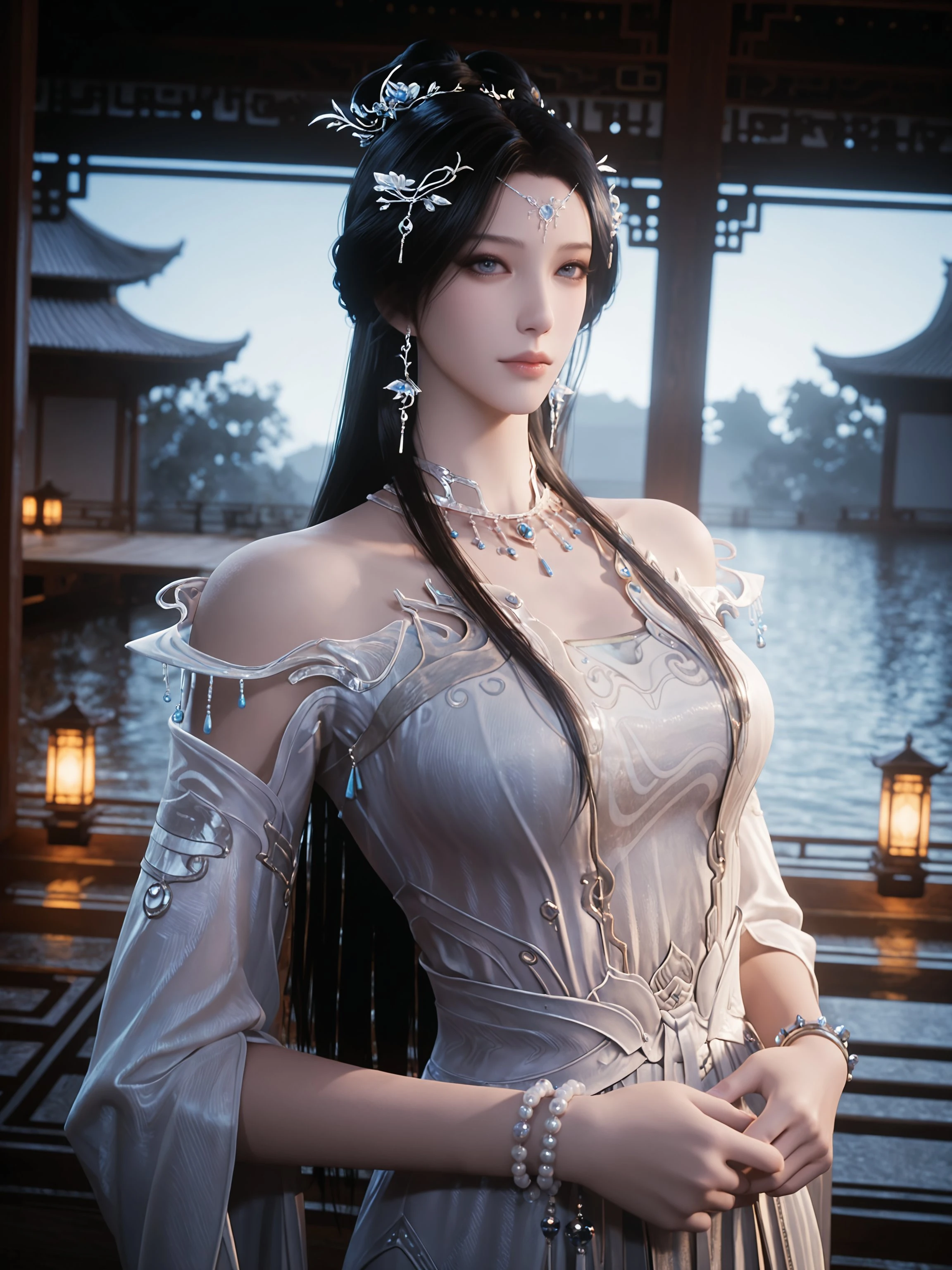 outsuit1,1girl,jewelry,black hair,dress,solo,long hair,hair ornament,earrings,forehead mark,bracelet,necklace,facial mark,white dress,upper body,blue eyes,hair bun,bare shoulders,beads,