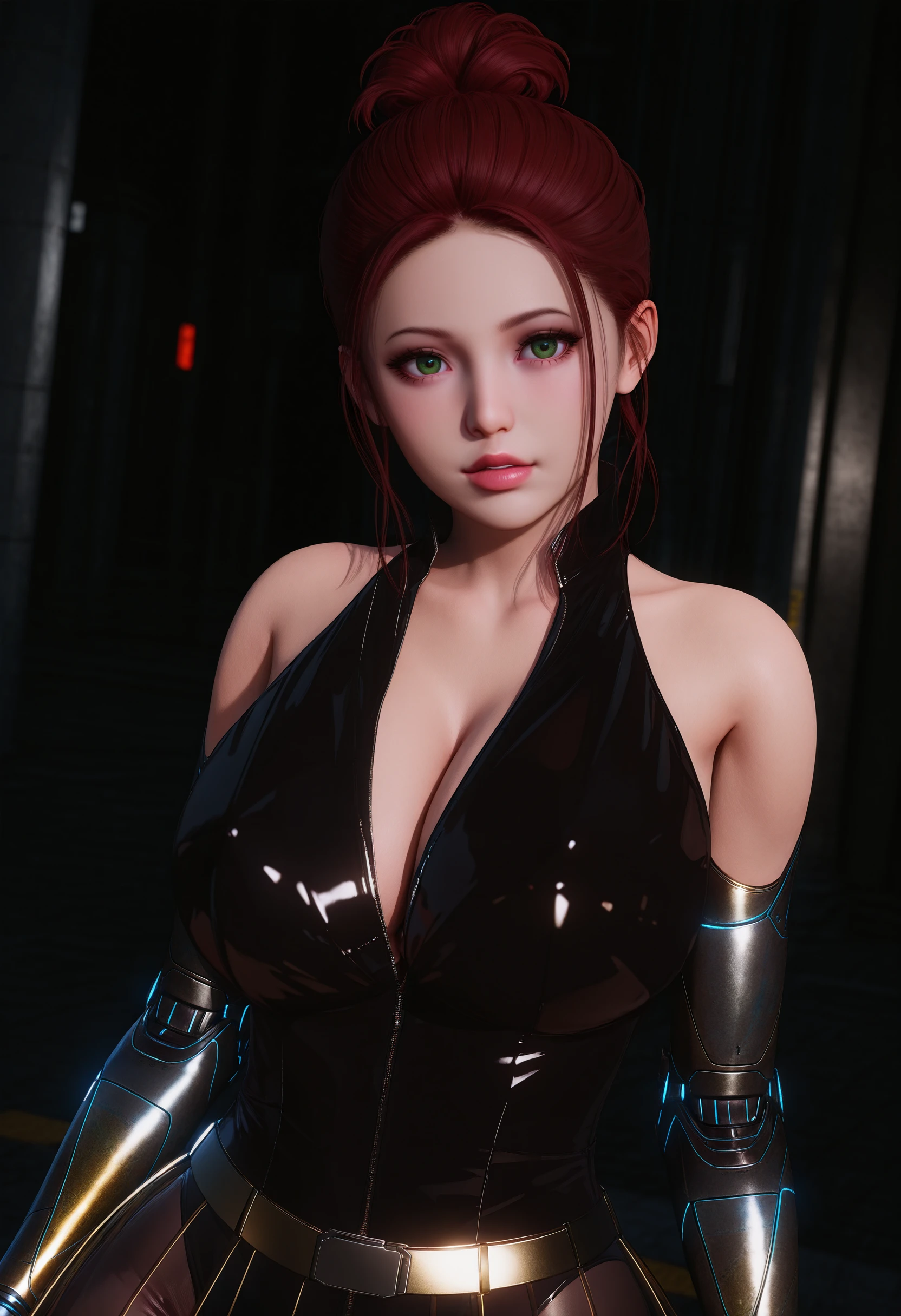 single hair bun, bare shoulders, black leotard, cleavage, mechanical arms, see-thru skirtHeist Outfit