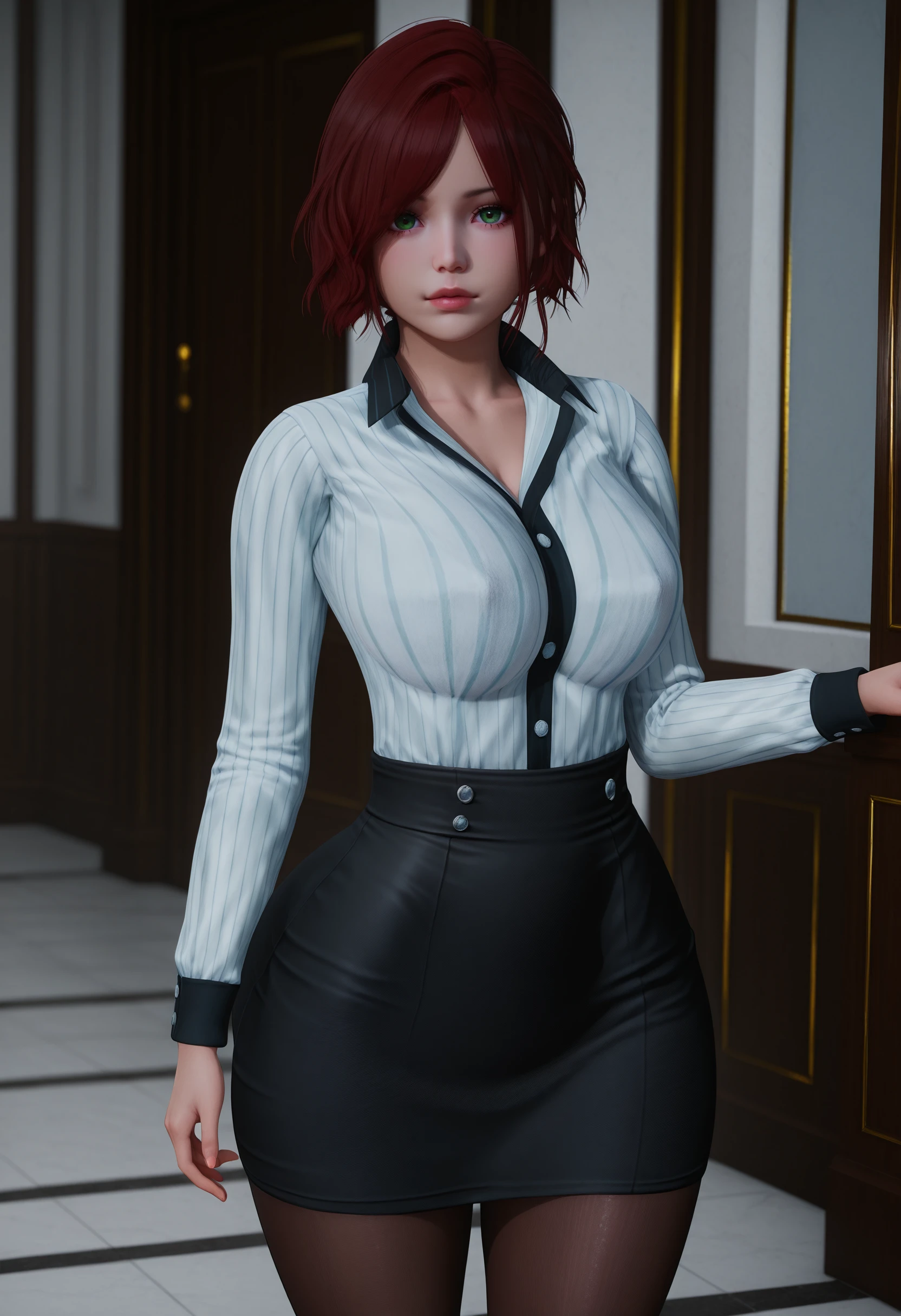 short hair, black pencil skirt, long sleeves, white striped shirt, pantyhoseRoman Peasant Outfit