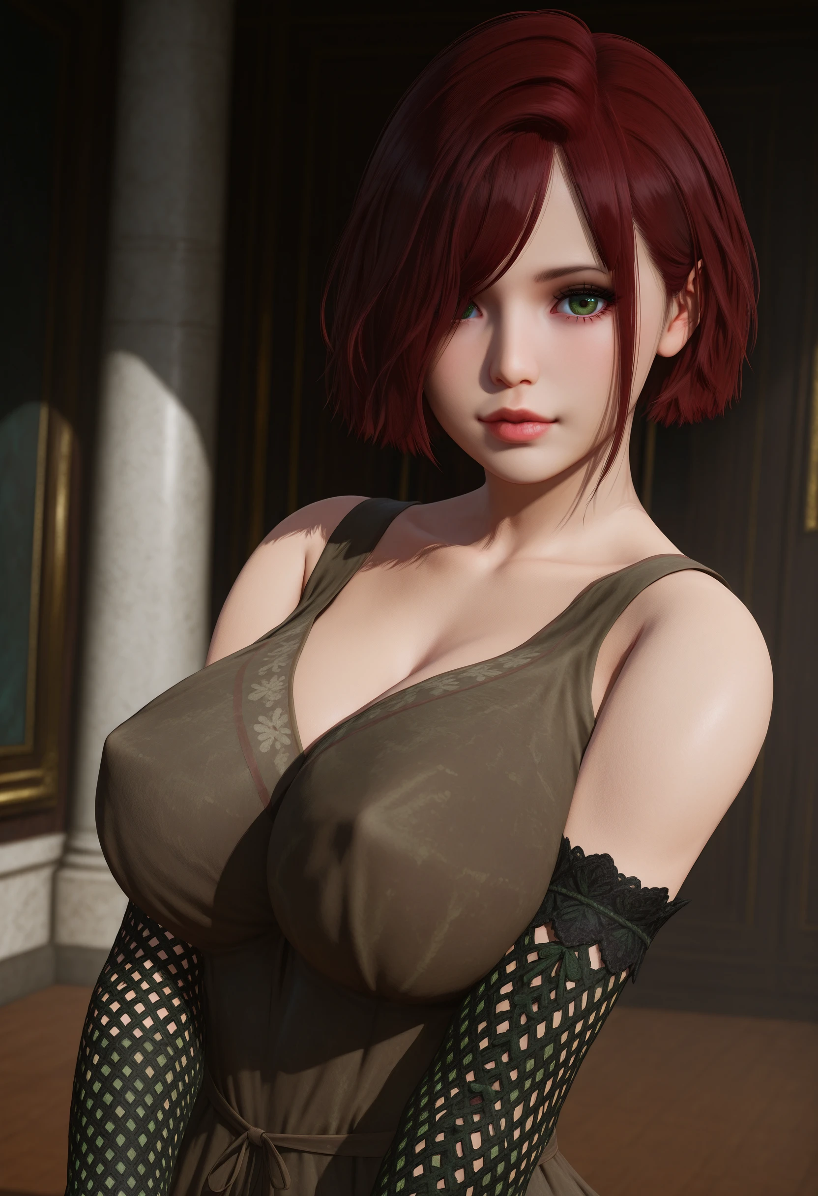 short hair, bare shoulders, brown dress, detached sleeves, hair over one eyePirate Outfit