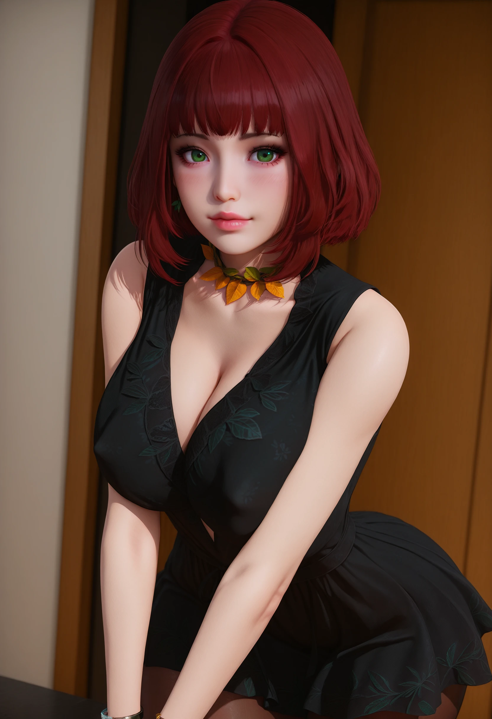 black dress, sleeveless, blush, pantyhose, orange leaf necklace, bracelet, cleavage, short hair, bangsGym Outfit