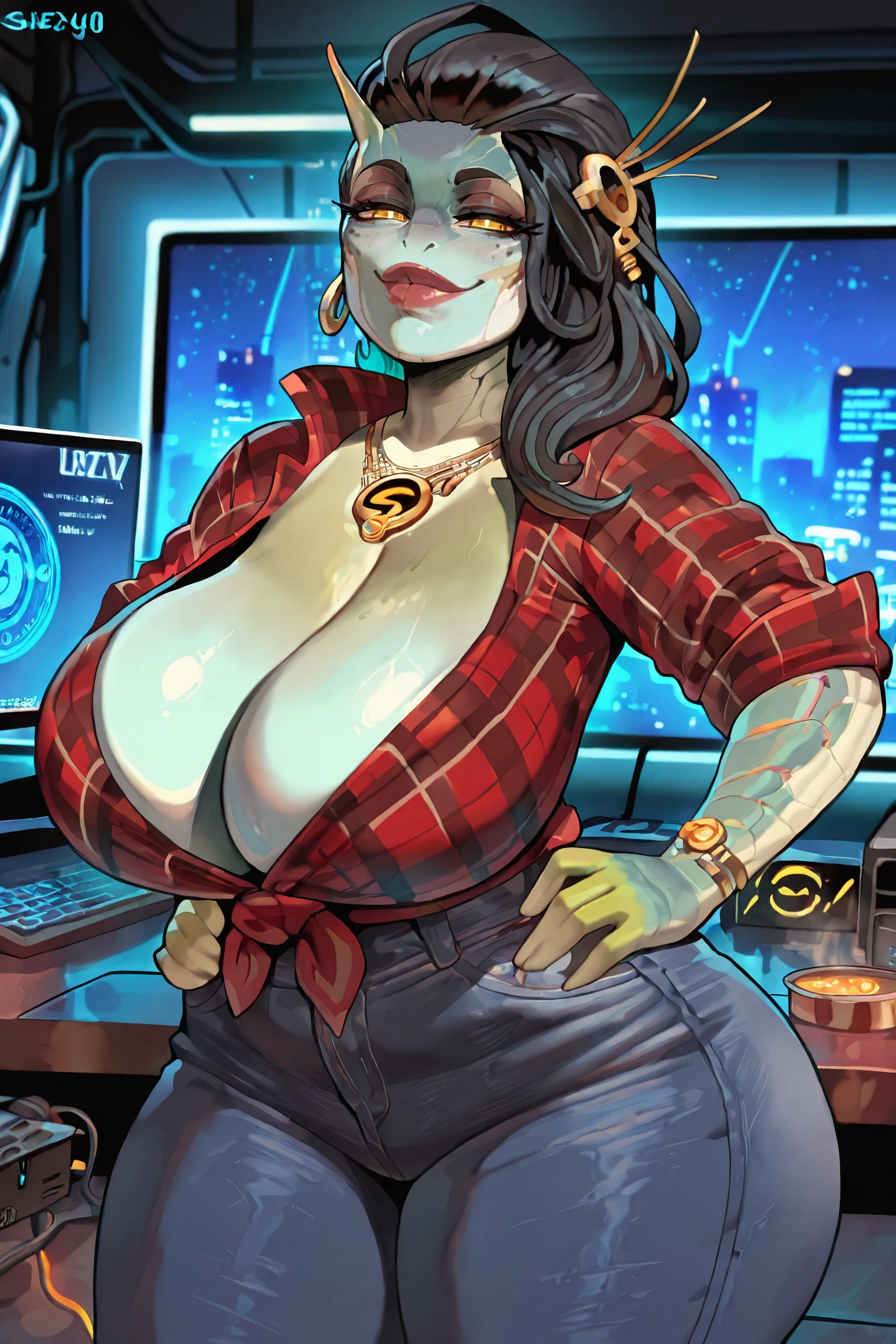 jenestra omalfi'meos, lumeris, alien, fish, fish humanoid, mature female, big breasts, jewerly, black hair, makeup, 1girl, multicolored skin, grey skin,,cleavage, plump lips, lipstick, yellow sclera,black pupils