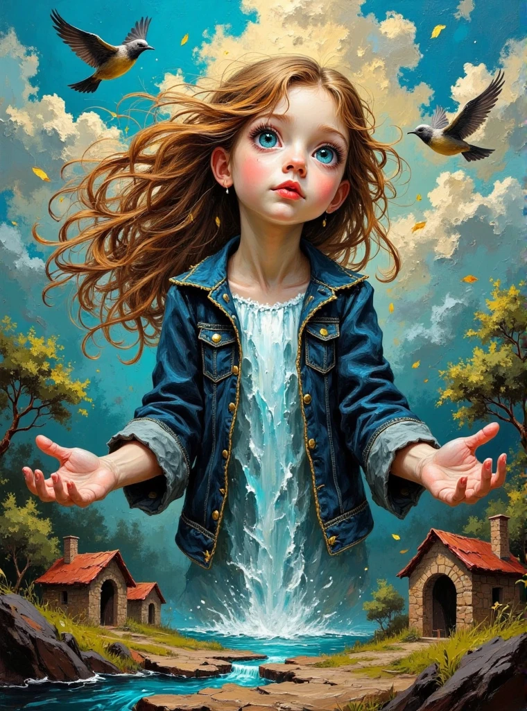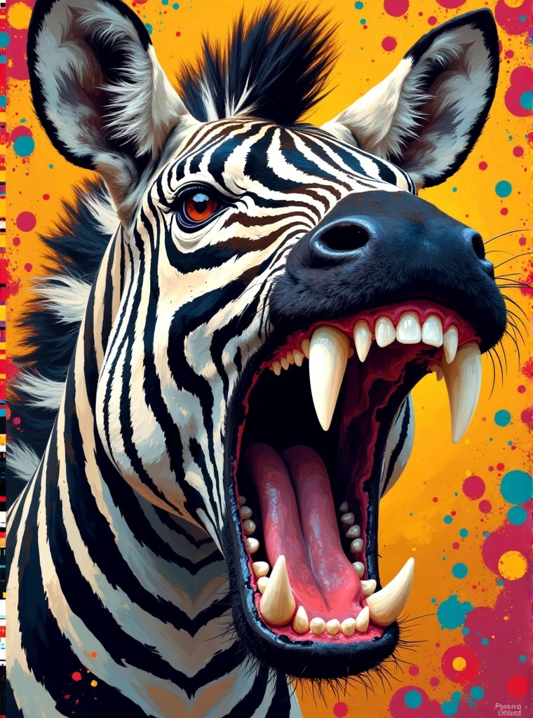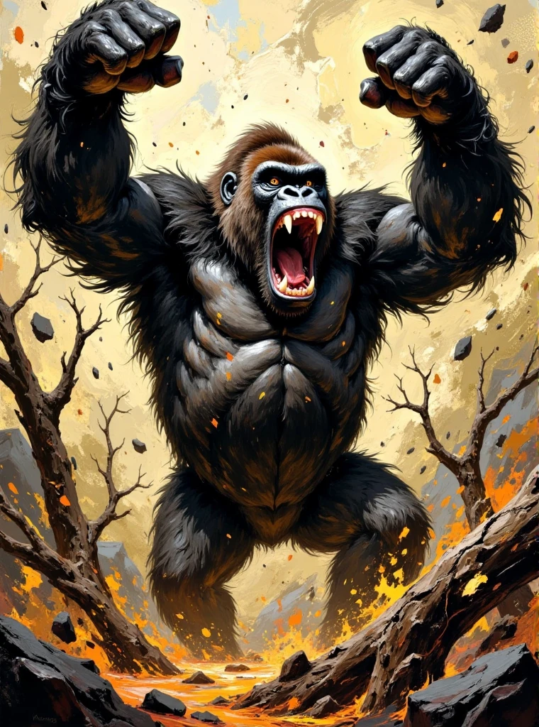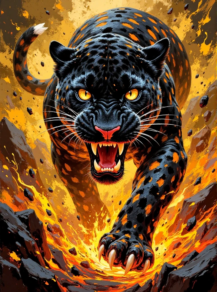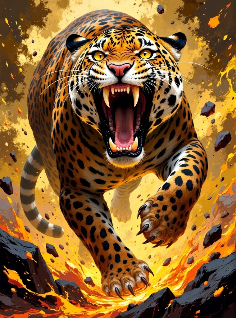 Oil color blocks style, A huge leopard with twisted patterns like flames, its eyes as big as copper bells, shimmering with fierce light, and its bloodthirsty mouth wide open, capable of swallowing a small deer. The limbs are as thick as stone pillars, the claws are as sharp as daggers, and they are running at an exaggerated speed. A hurricane rises behind them, distorting and deforming the surrounding scenery