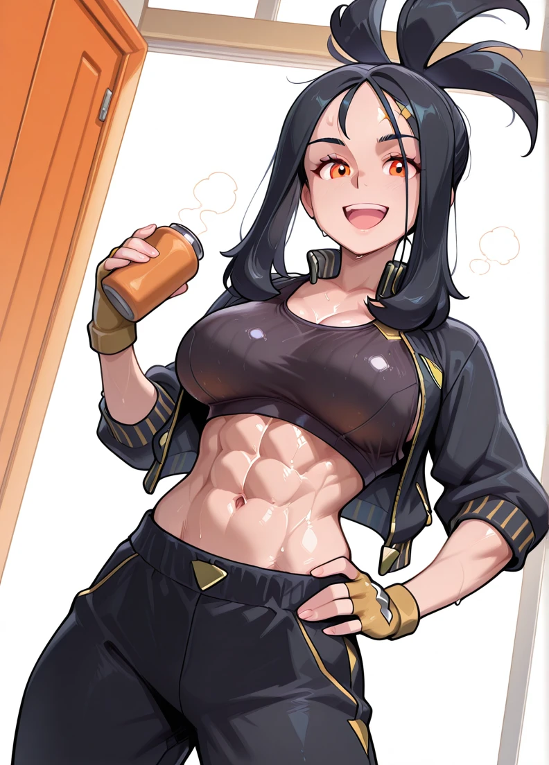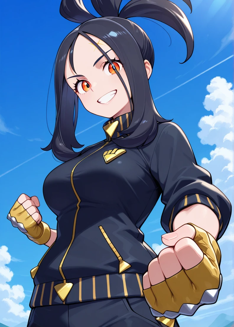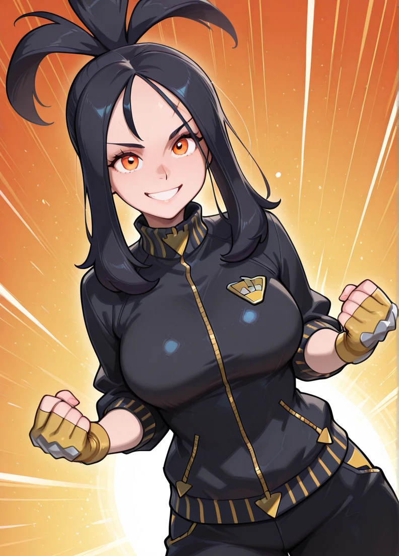 dendraxd,orange eyes,long hair, black hair,ponytail,