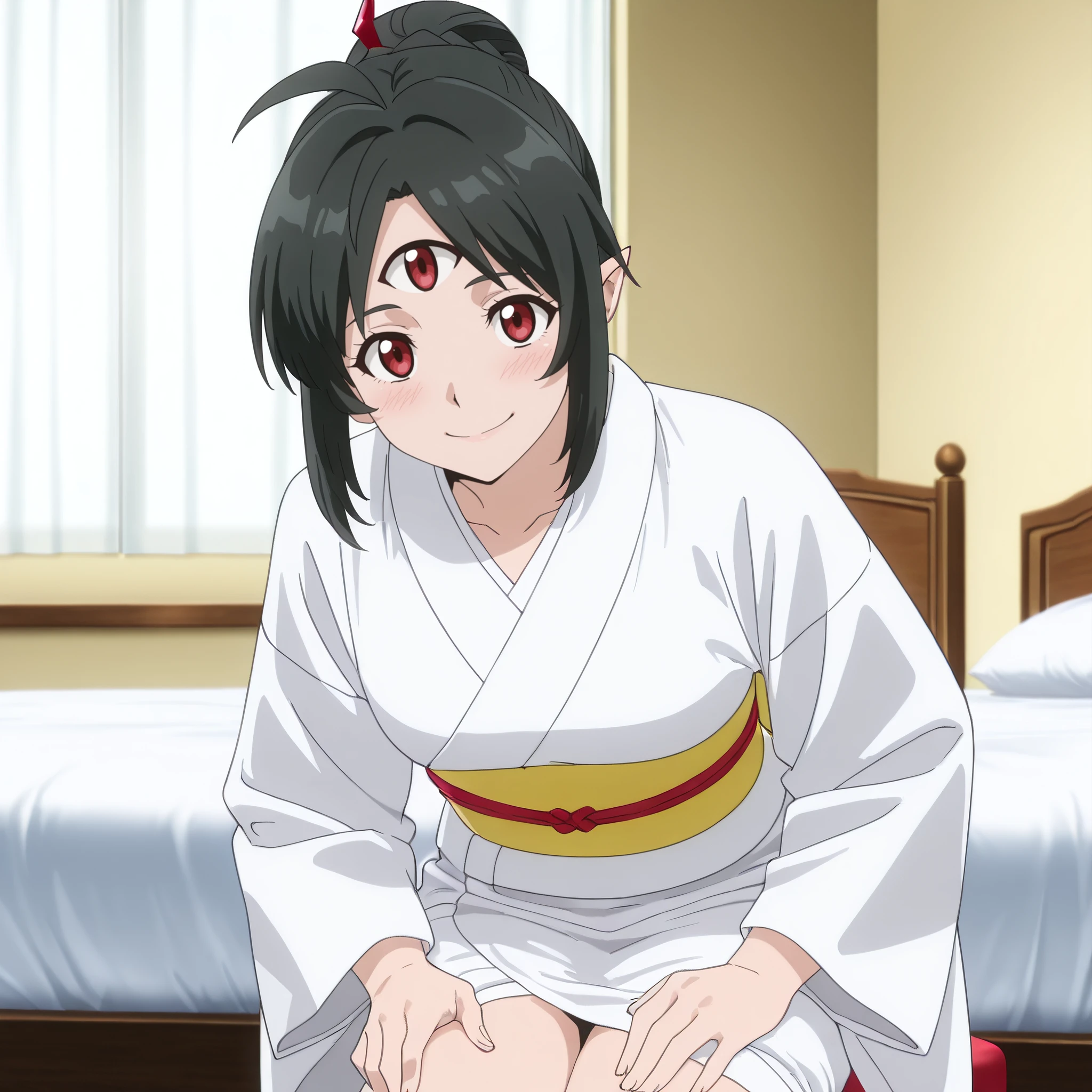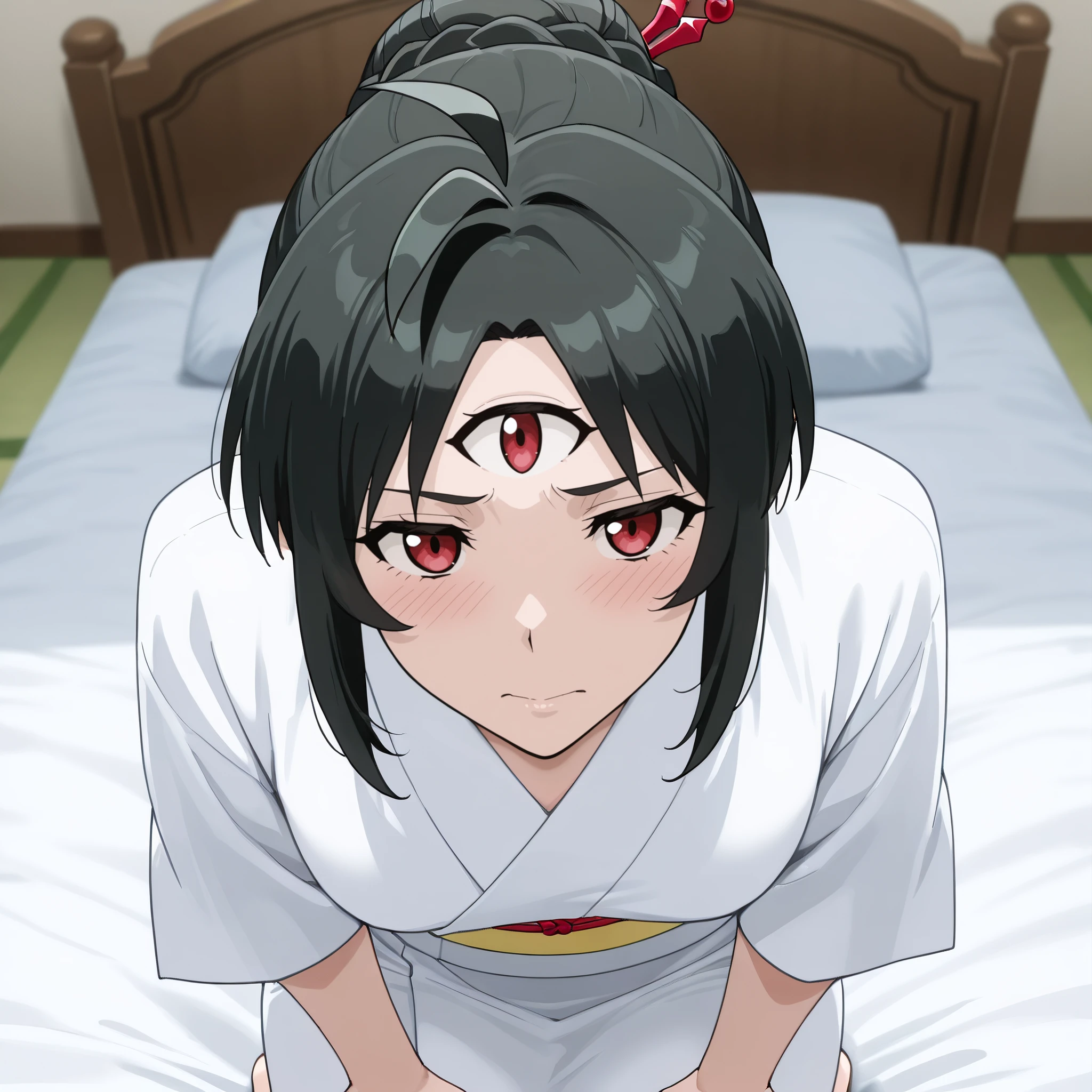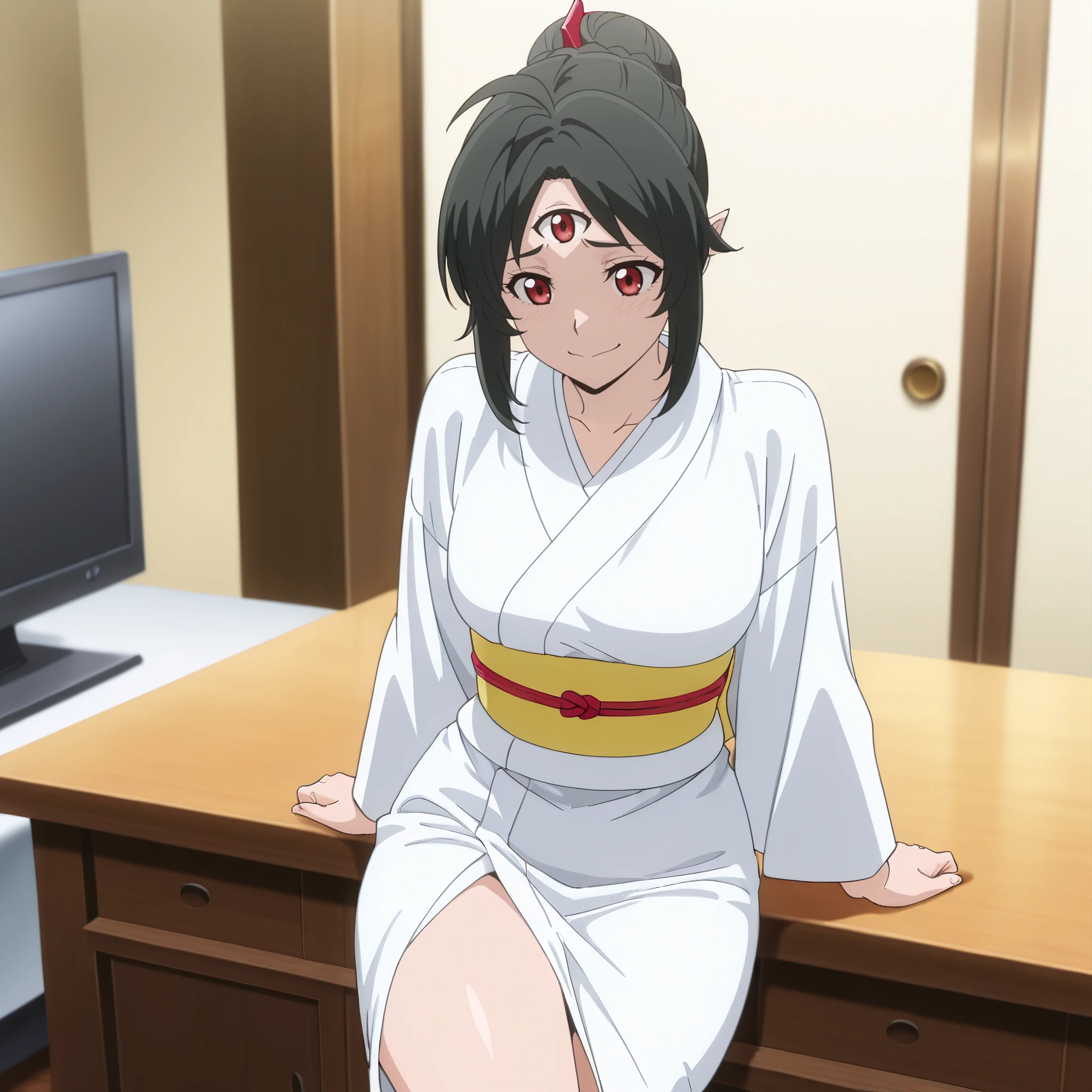 ReMonsterMe, red eyes, black hair, short hair, extra eyes, ahoge, third eye, single hair bun, pointy ears, hair ornament,