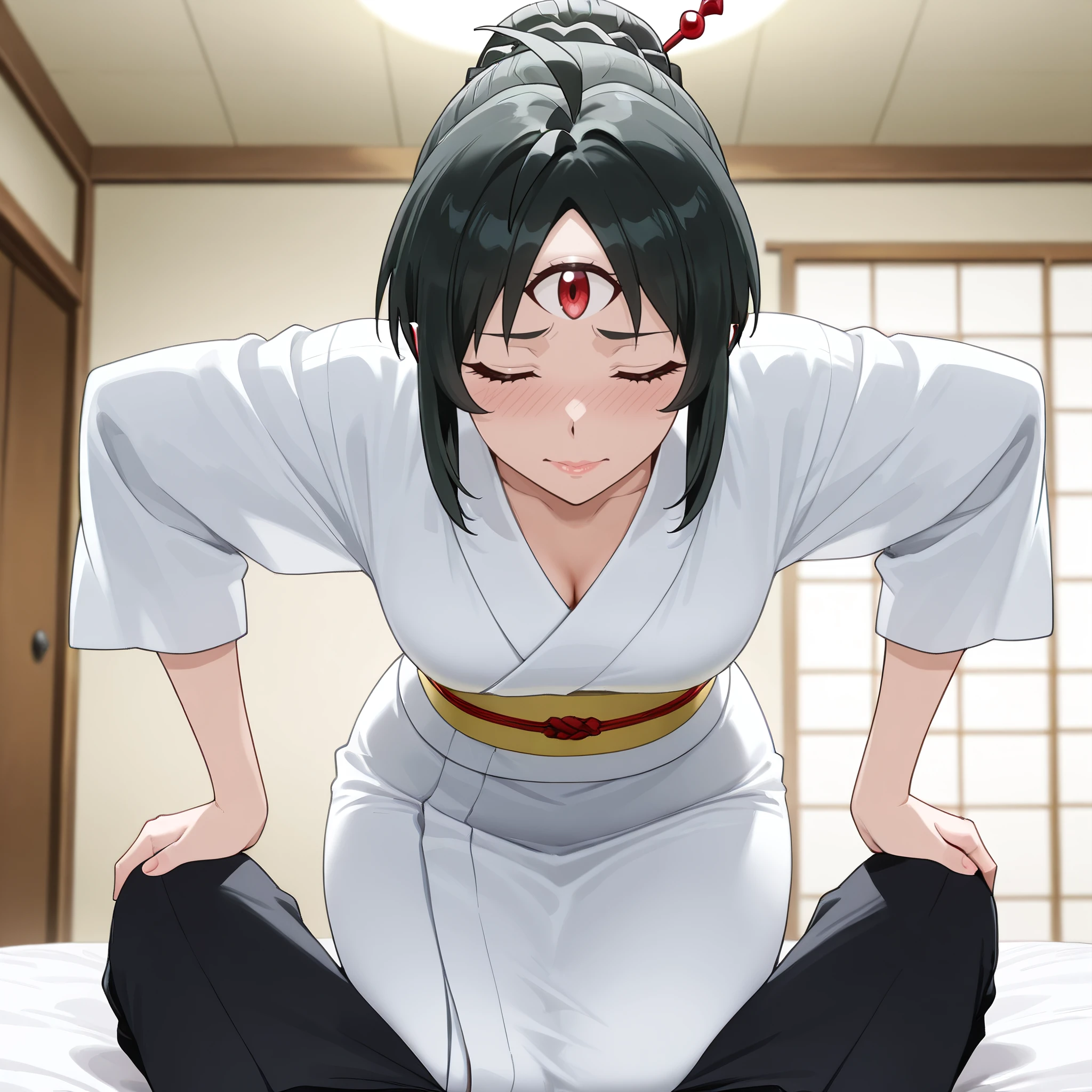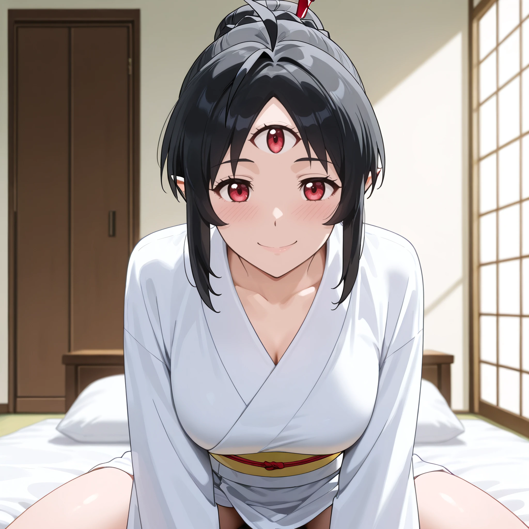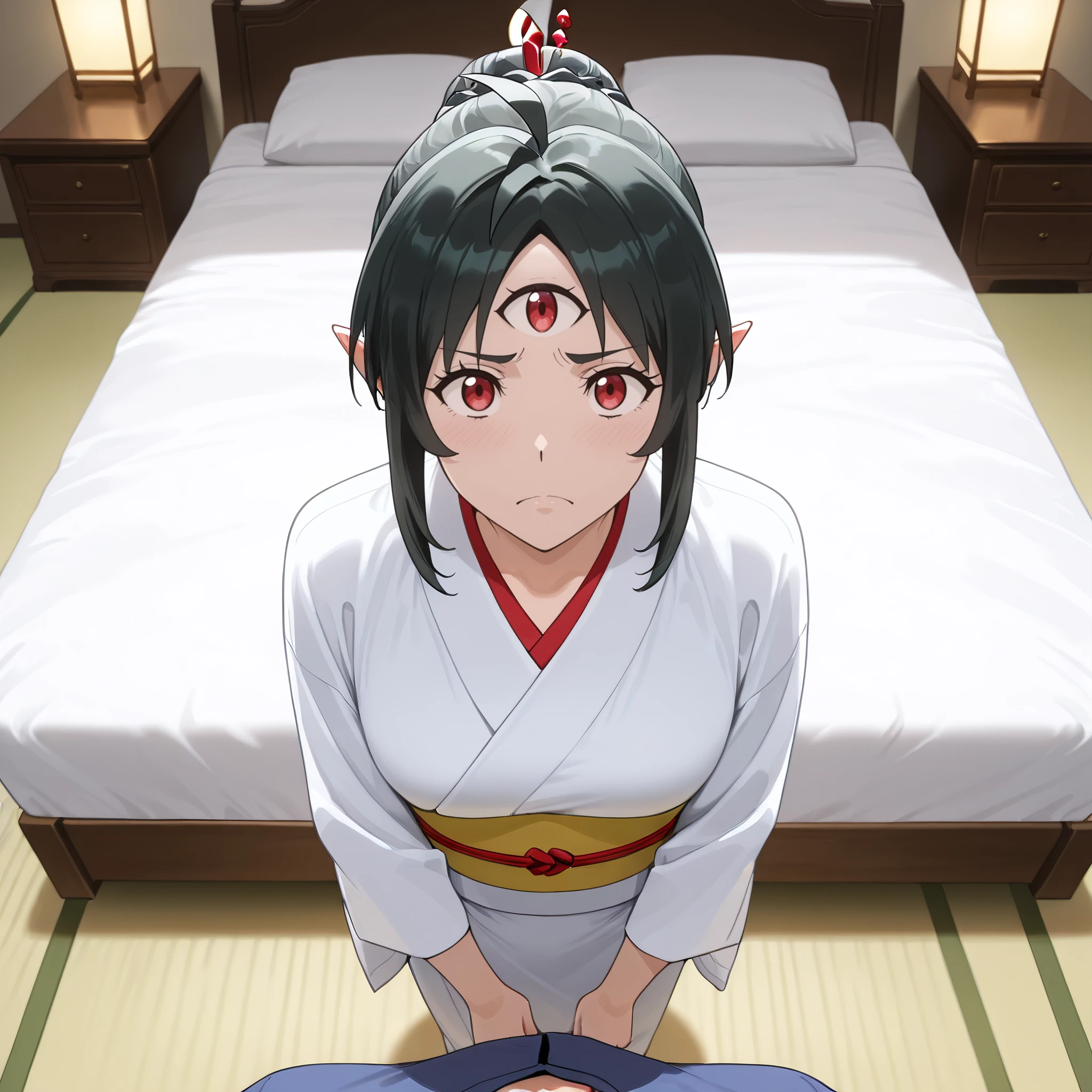 ReMonsterMe, red eyes, black hair, short hair, extra eyes, ahoge, third eye, single hair bun, pointy ears, hair ornament,
