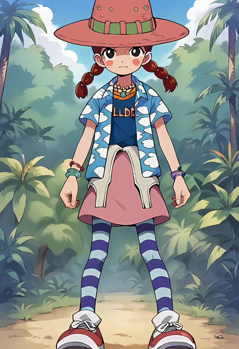 Clothing: hat, striped pantyhose, hawaiian shirt, blue shirt, pink skirt, necklace, bracelet,