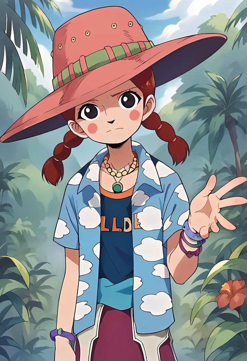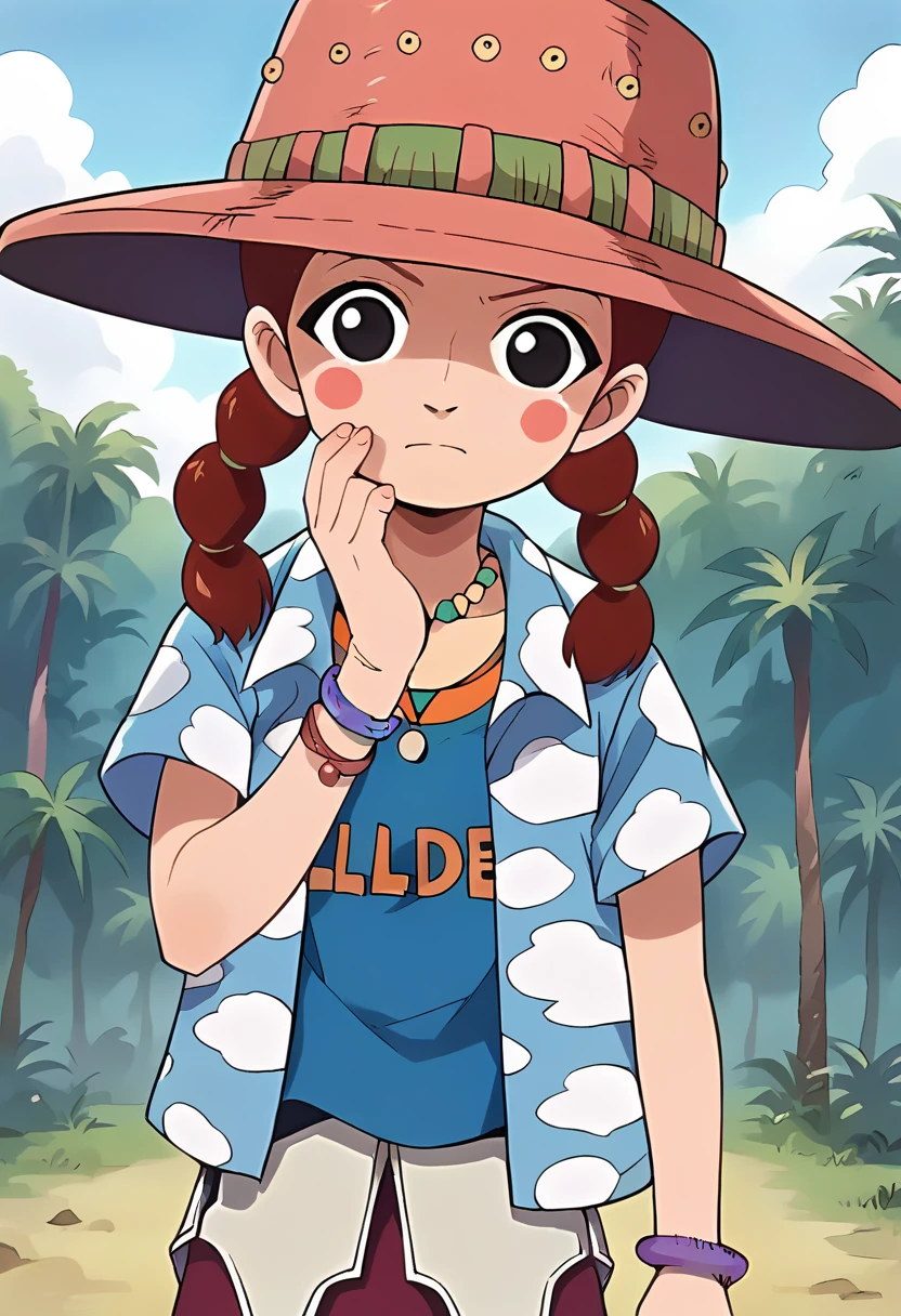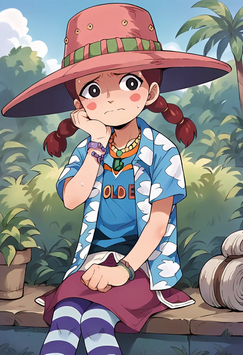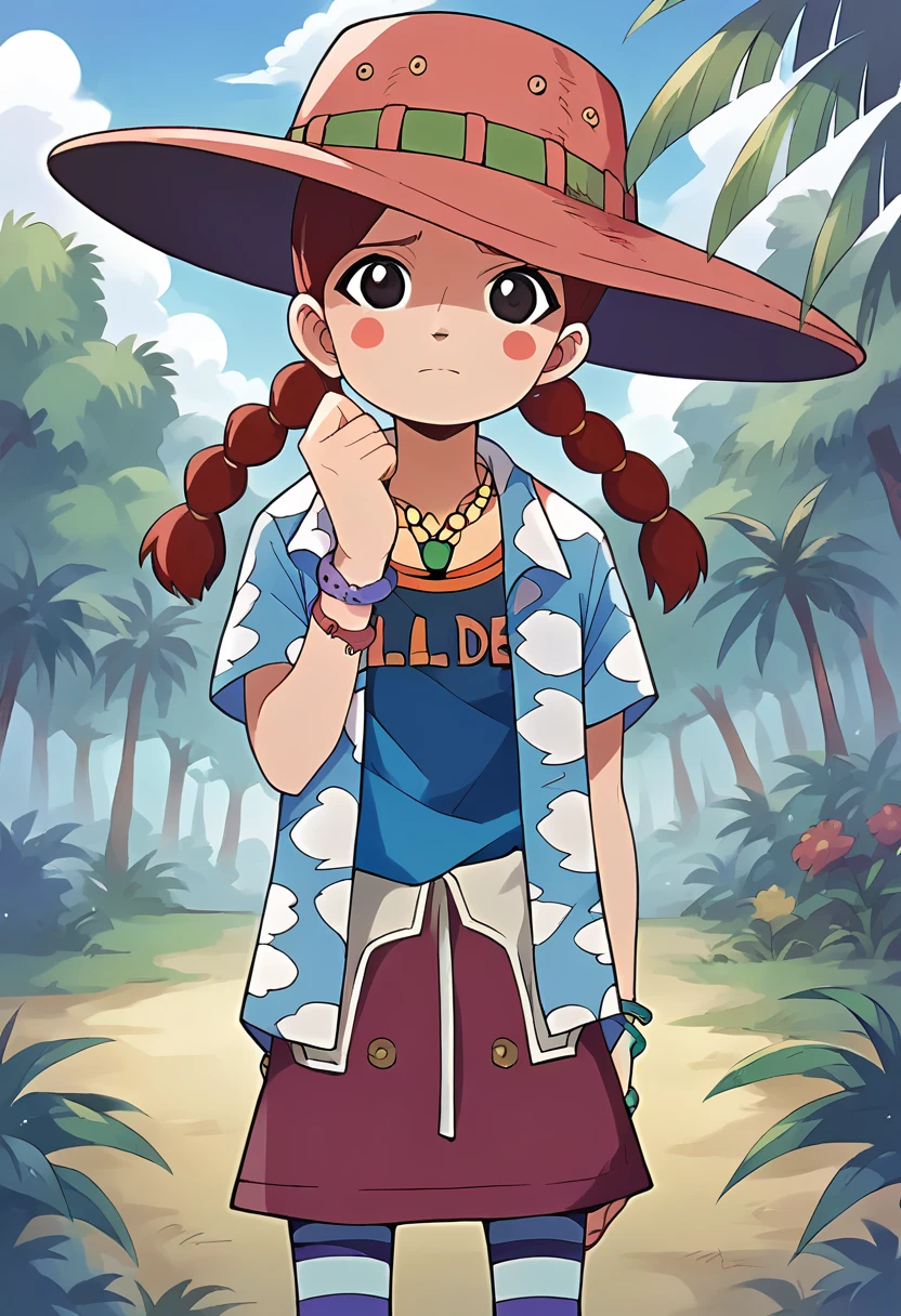 score_9, score_8_up, score_7_up, source_anime, masterpiece, 1girl, ctianmari, hat, striped pantyhose, hawaiian shirt, blue shirt, pink skirt, necklace, bracelet, looking at viewer, blush stickers, outdoors, Negative prompt ❌: