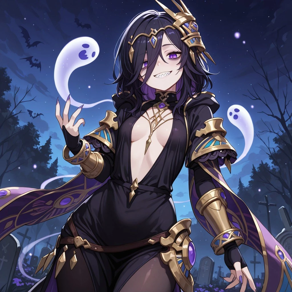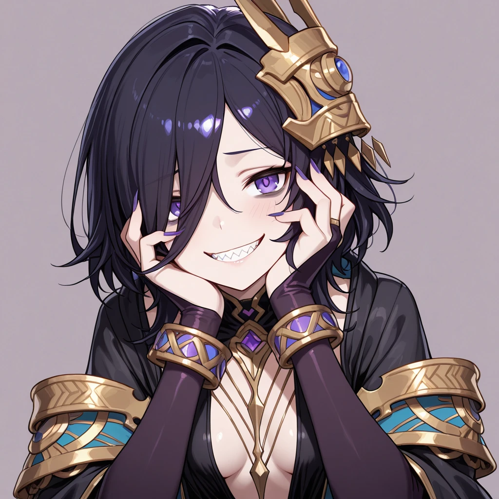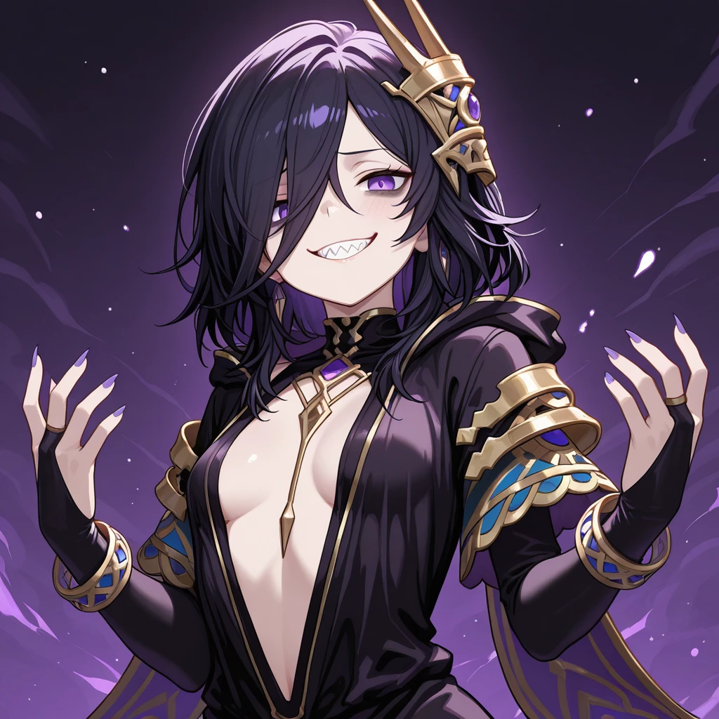 black hair, hair over one eye, purple eyes, bags under eyes, purple nails, sharp fingernails, small breasts,