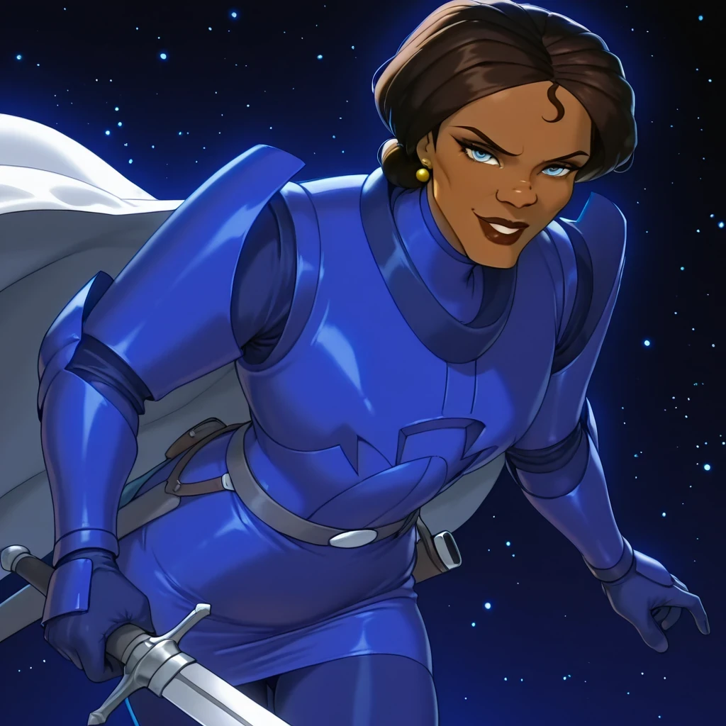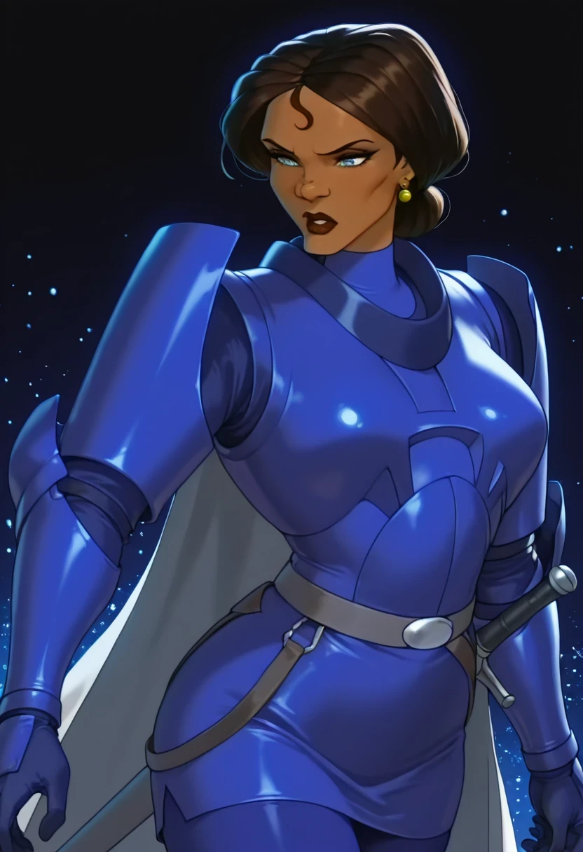 blue armor, chestplate, arms guard, white cape, gloves, blue tight, gray belt, gray scabbard, blue skirt, golden earrings, greaves,
