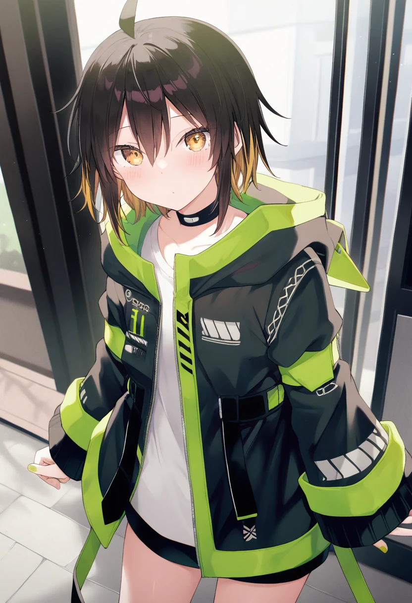 noa\(maimai\), 1girl, ahoge, brown hair, blonde hair, multicolored hair, yellow eyes, green nails, black jacket, short jacket, breast pocket, green ribbon, grey shirt, black pants, black boots, cat hood, hood up, green armband, sleeves past wrists, standing, belt collar,