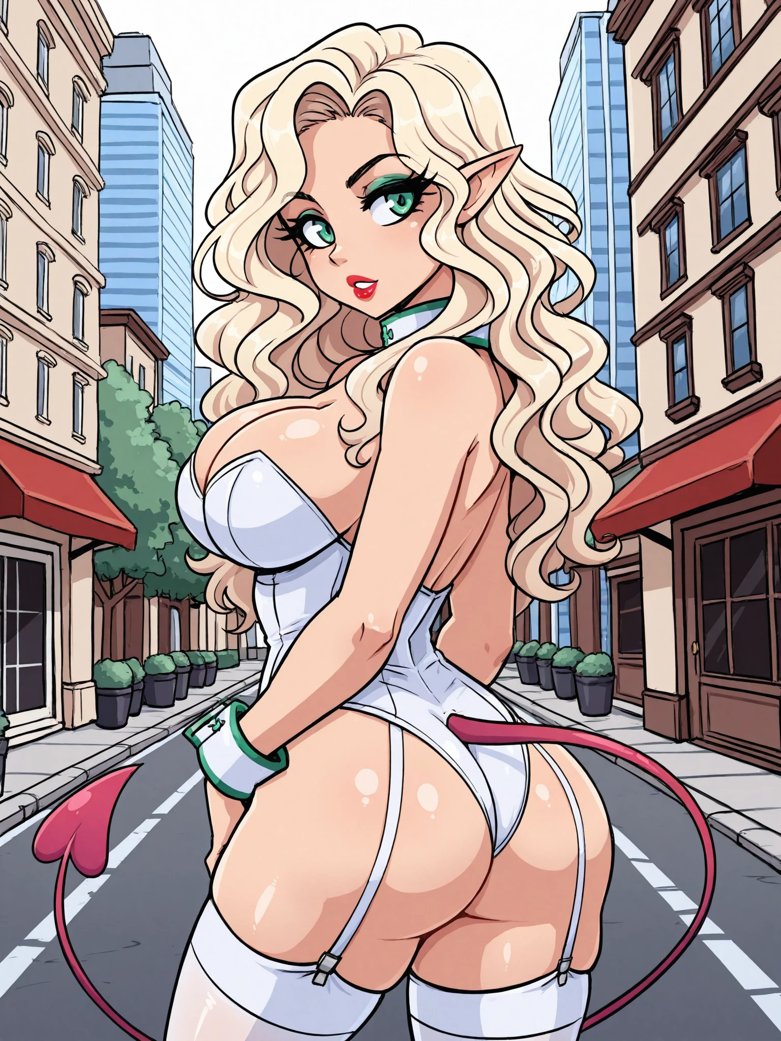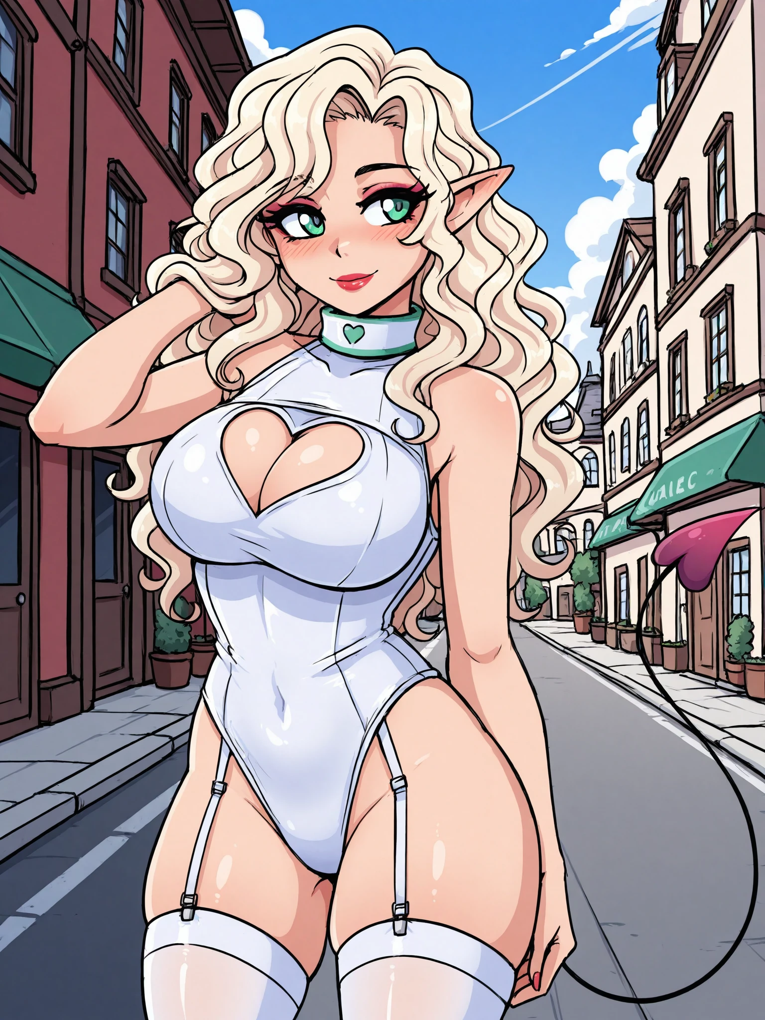 General: 1girl, solo, long hair, wavy hair, blonde hair, pointy ears, aqua eyes, makeup, lipstick, cleavage, breasts, large breasts