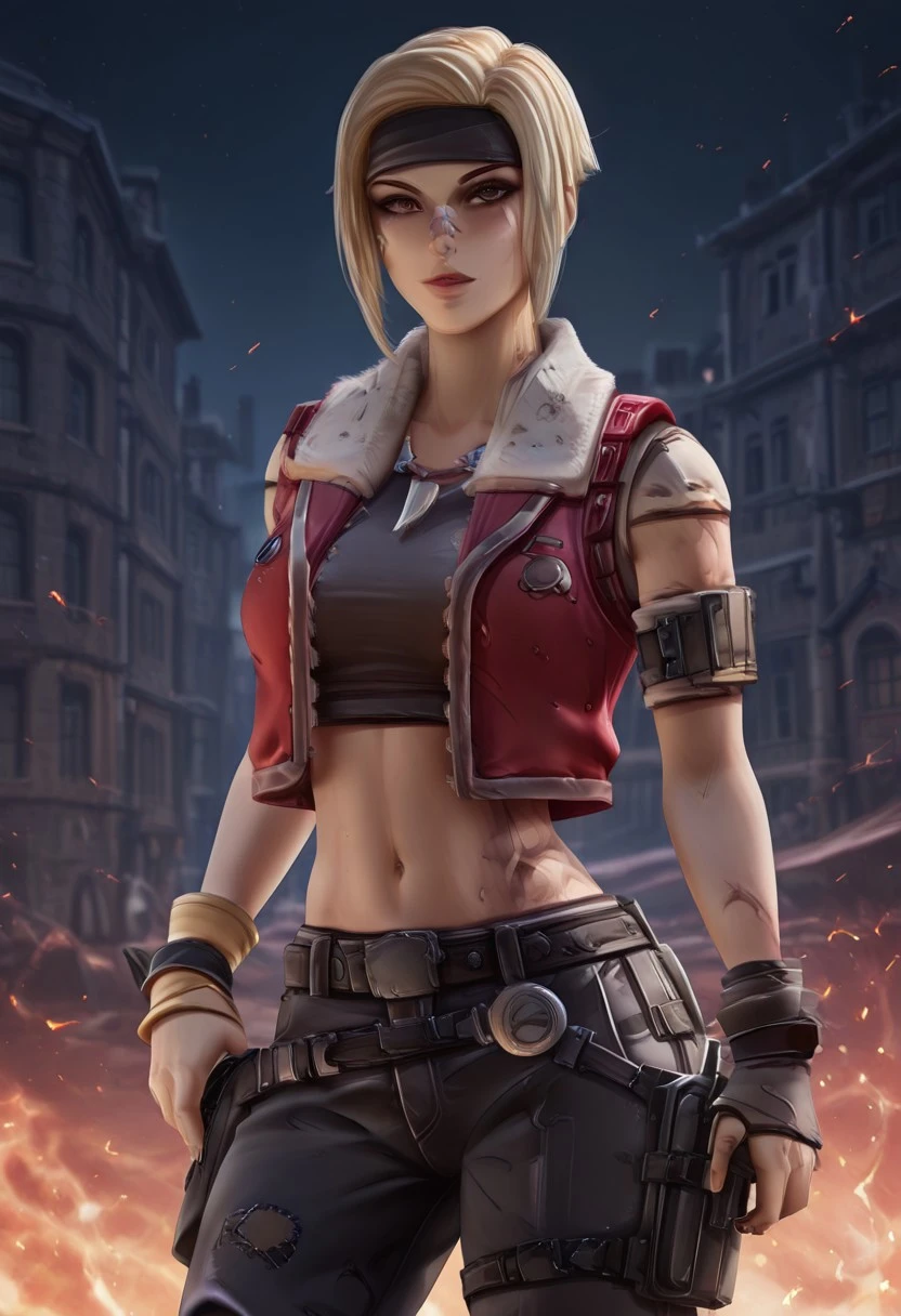 1girl, short hair, blonde hair, headband, black crop top, red vest, black pants, belts, holster, armband, yellow wristband, brown eyes, (scars on left side of body)