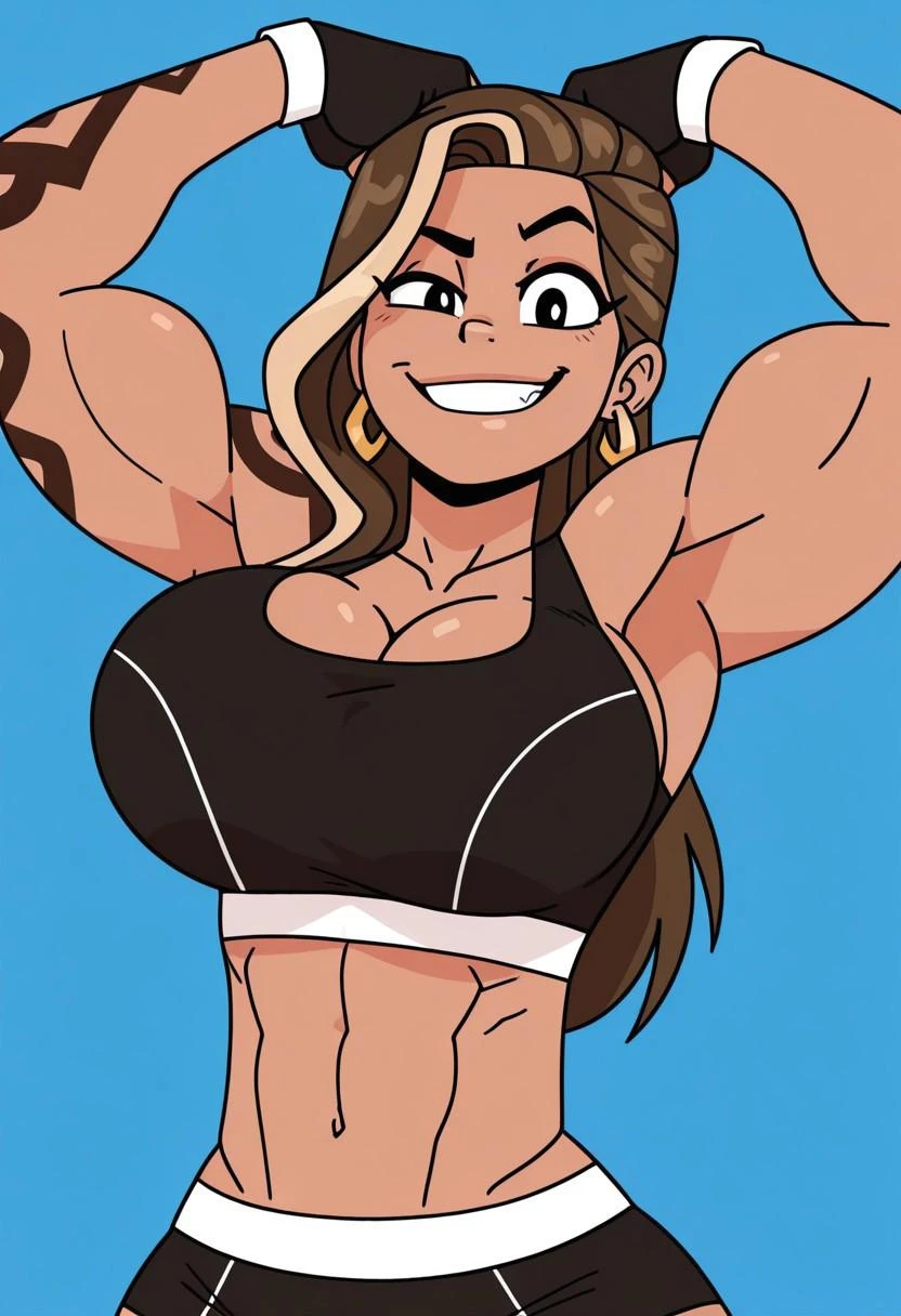 1girl, solo, ruby, muscular female, dark-skinned female, brown hair, long hair, streaked hair, black eyes, gold earrings, black sports bra, black shorts, black gloves, fingerless gloves, white trim, cleavage, midriff, one tattoo sleeve, one bare arm,