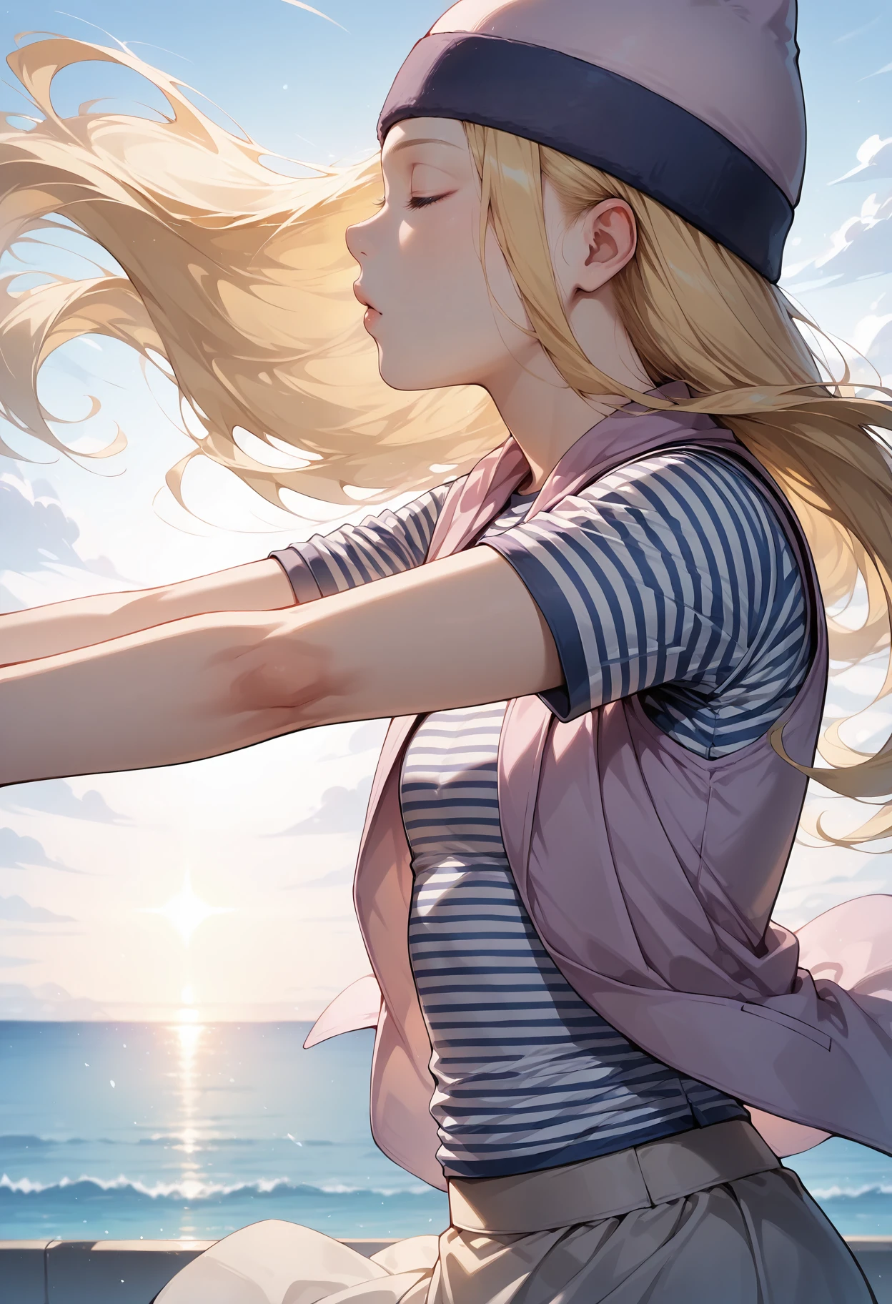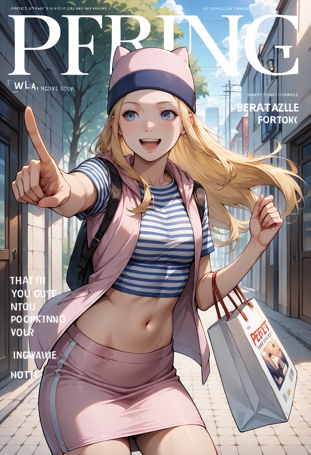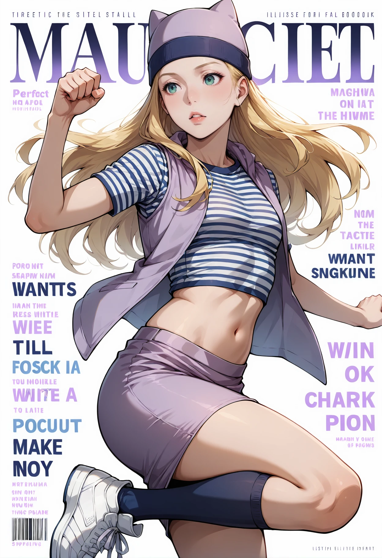 Outfit: hat,cat hat,beanie,animal hat,striped shirt,skirt,sneakers,shoes,shirt,socks,midriff,kneehighs,short sleeves,miniskirt,blue socks,vest,purple skirt,open clothes,crop top,black socks,pencil skirt,jacket,white footwear