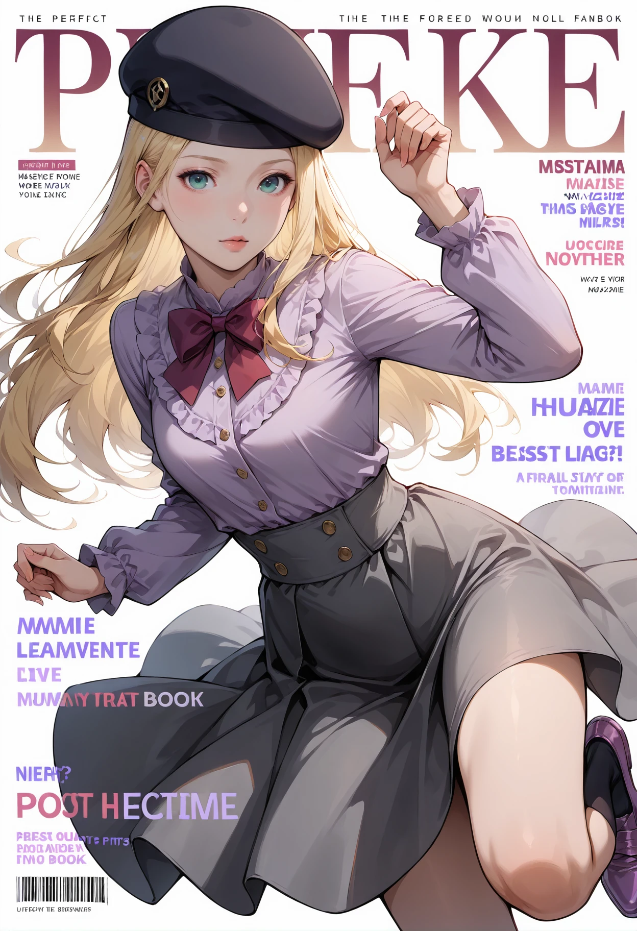 Causal dress Outfit: bangs,hat,beret,skirt,purple footwear,black headwear,shirt,black skirt,socks,long sleeves,bow,purple bow,ribbon,shoes,bowtie,frills,black socks,purple ribbon,purple shirt,red ribbon,red bow,purple bowtie,buttons,grey skirt,pink footwear,blouse