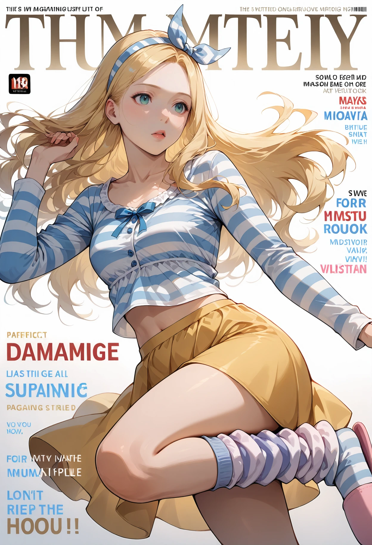 Home Outfit: hair ribbon,hairband,loose socks,slippers,striped,socks,long sleeves,bow,pajamas,hair bow,ribbon,skirt,yellow skirt,leg warmers