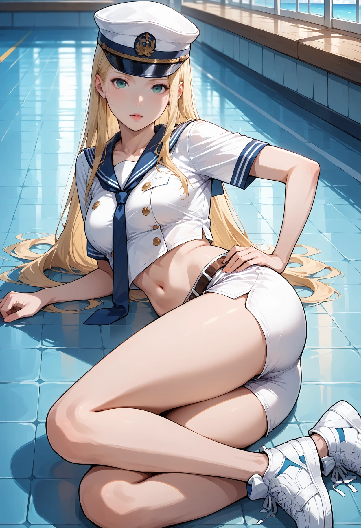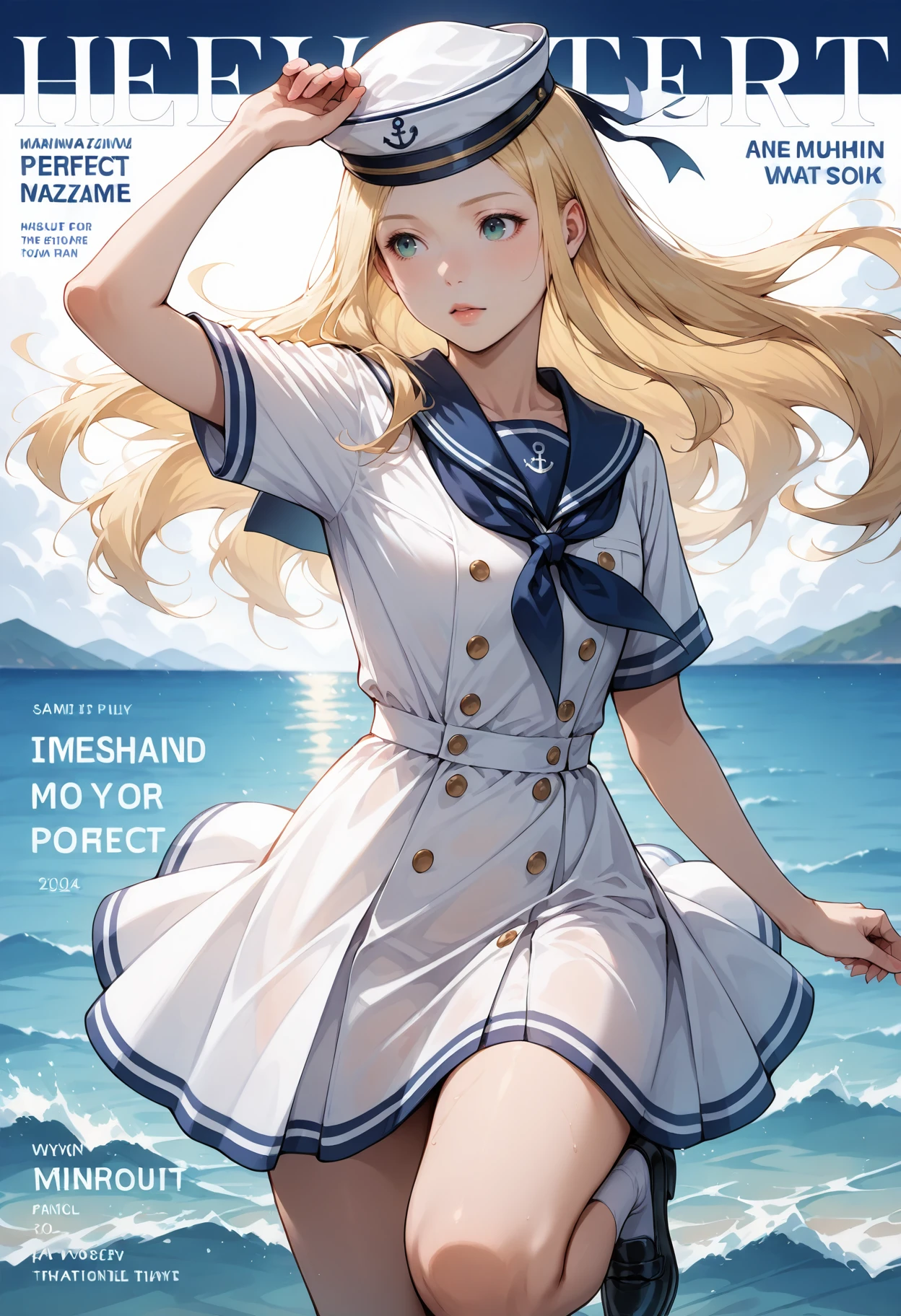 Sailor dress Outfit: hat,sailor hat,military hat,anchor symbol,sailor collar,sailor dress,dress,socks,shoes,blue sailor collar,sailor,short sleeves,black footwear,anchor print,white socks,white dress,buttons,shirt,neckerchief