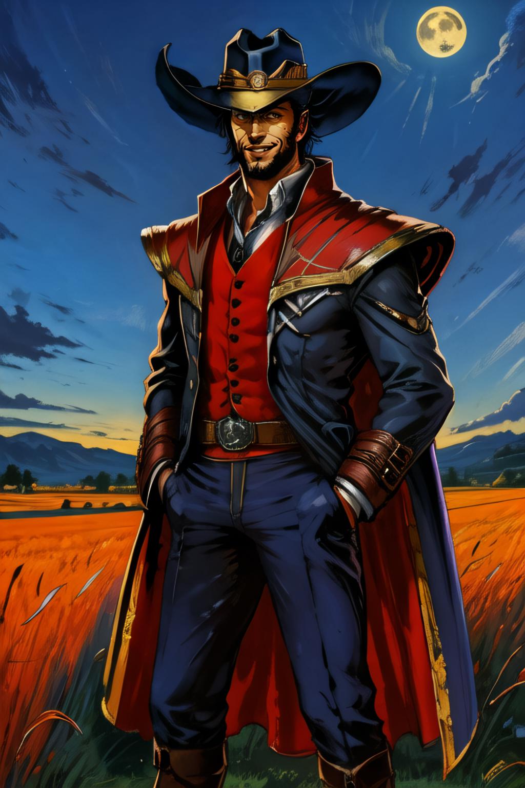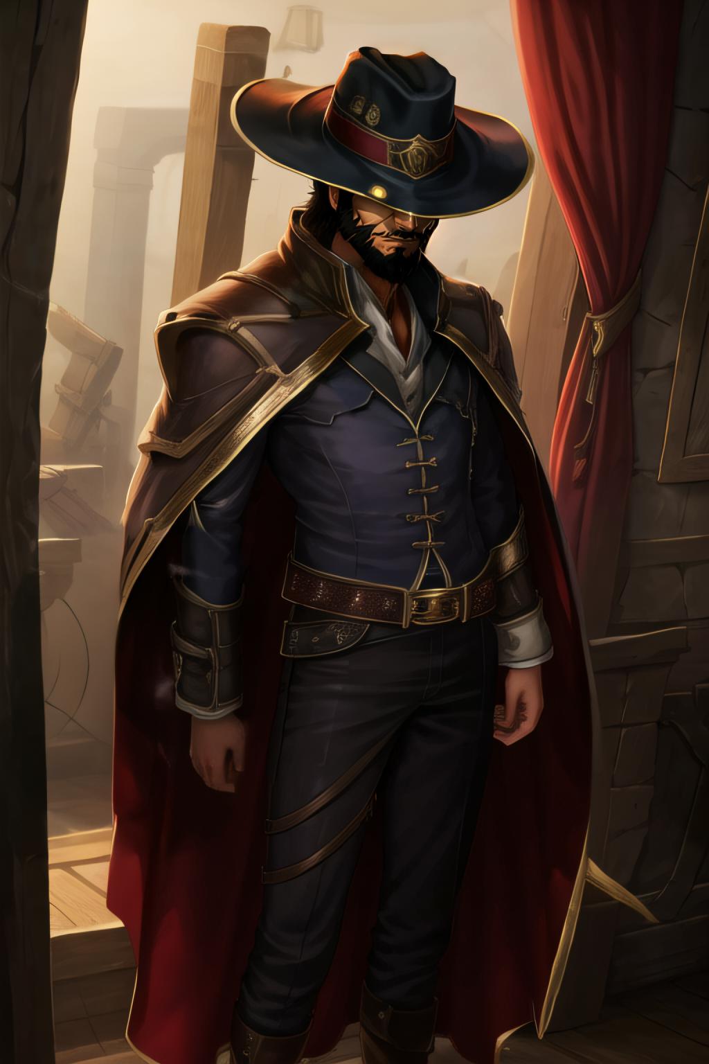 Main triggers - 1boy, twisted fate, coat, cape, hat, long black hair, beard, facial hair, glowing eyes