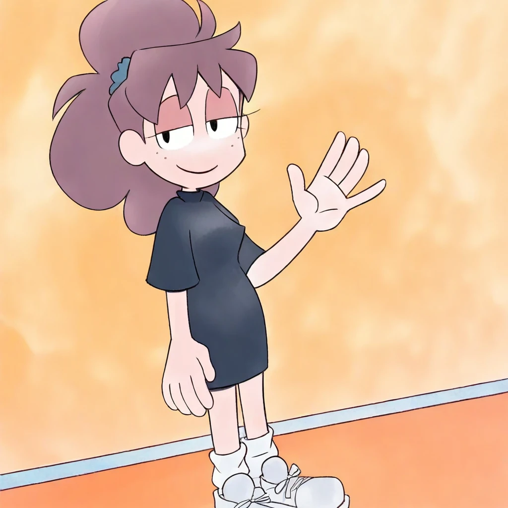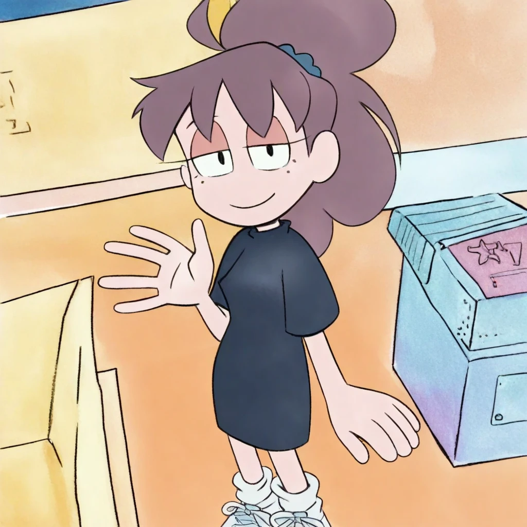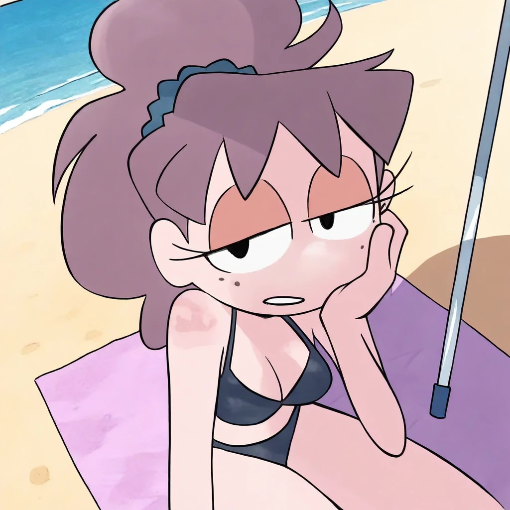 Score_9, score_8_up, score_7_up, 1girl, solo, lily_dayjob, brown hair, long hair, ponytail, bangs, scrunchie, freckles, black eyes