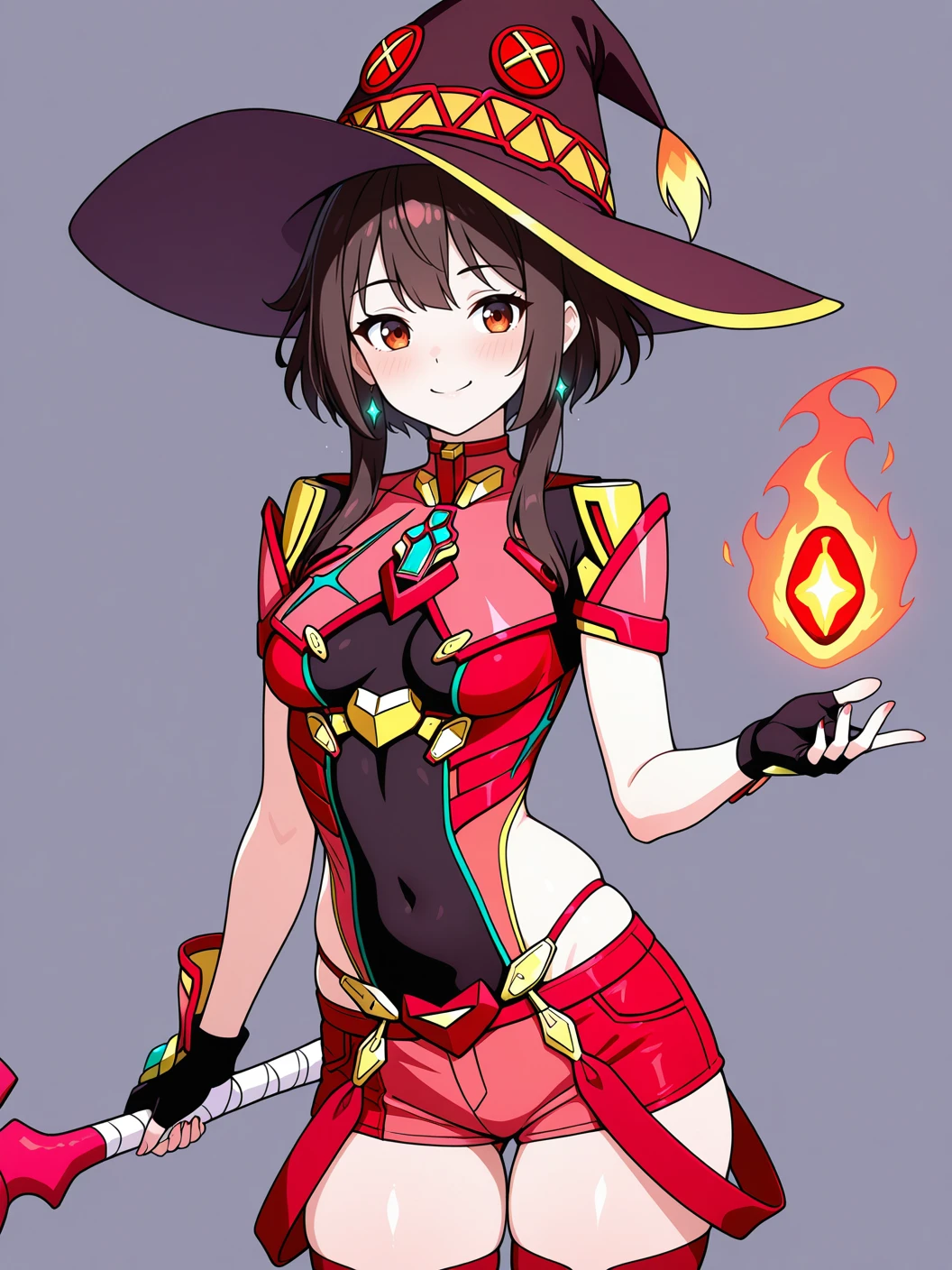 pyracosplay, two-tone clothes, pink breastplate, back ribbon, fingerless gloves, red short shorts, pink thighhighs, pink boots,
