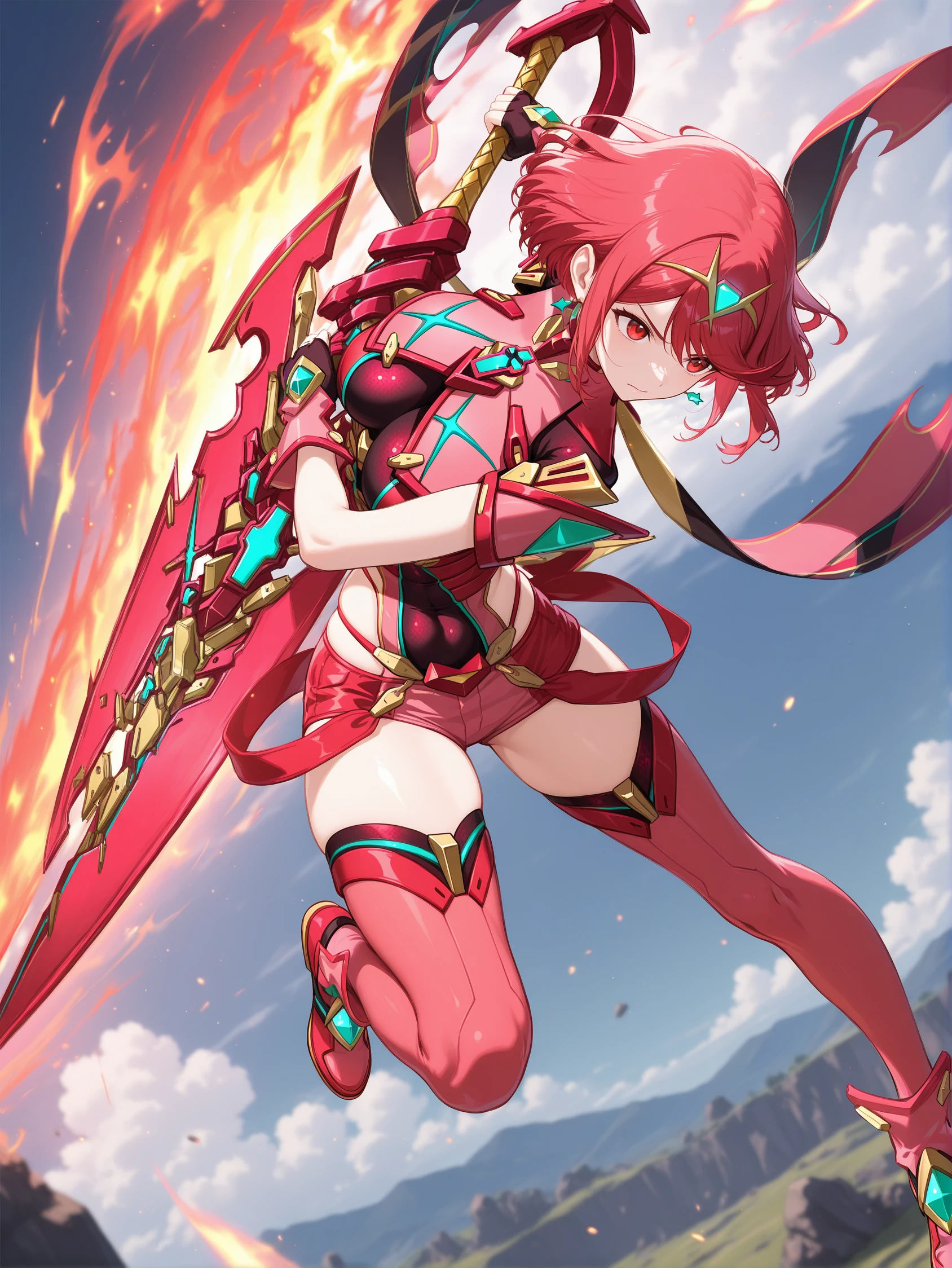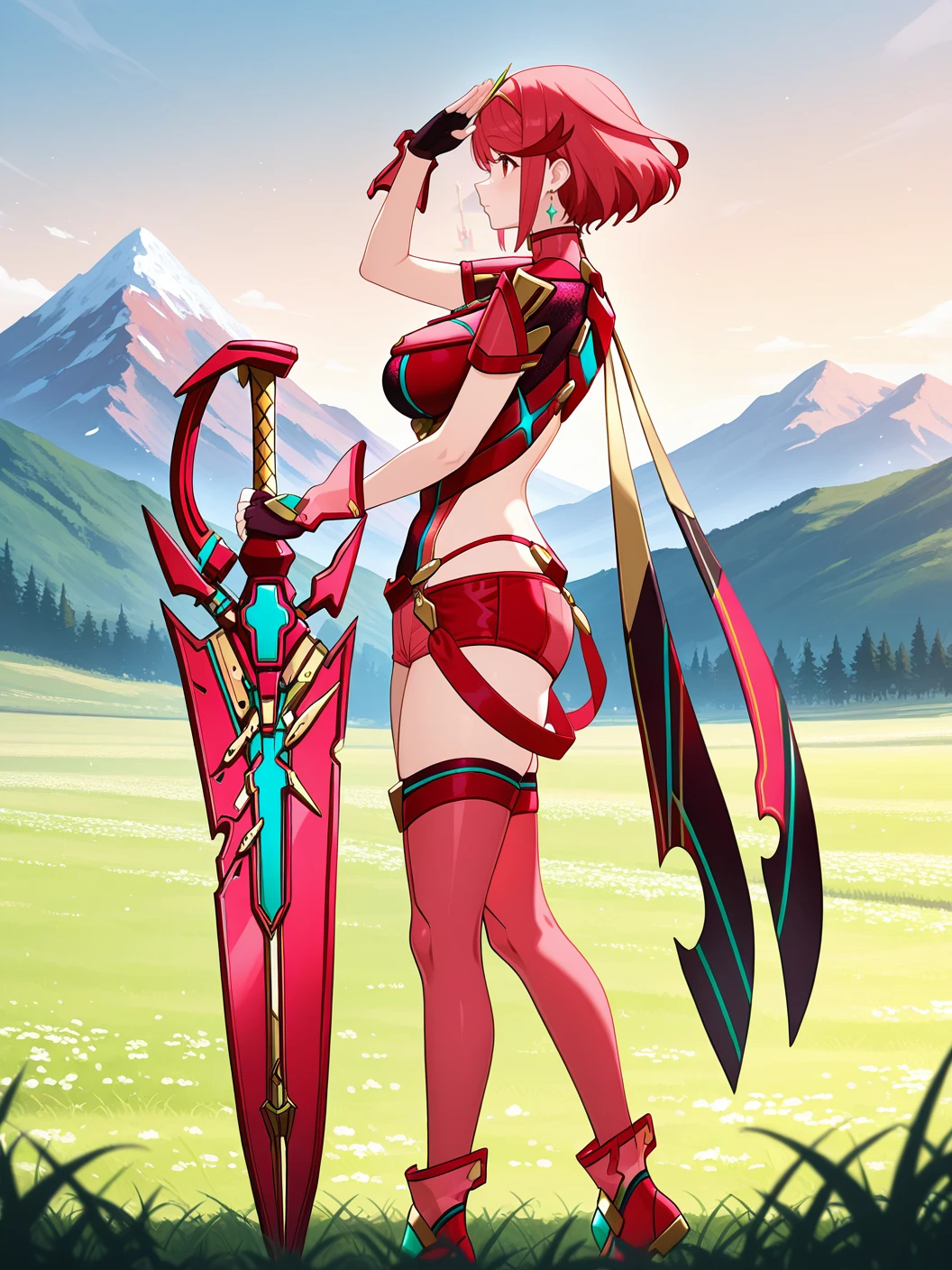 Trigger words: pyranormal, two-tone clothes, pink breastplate, back ribbon, fingerless gloves, red short shorts, pink thighhighs, pink boots, red aegissword,