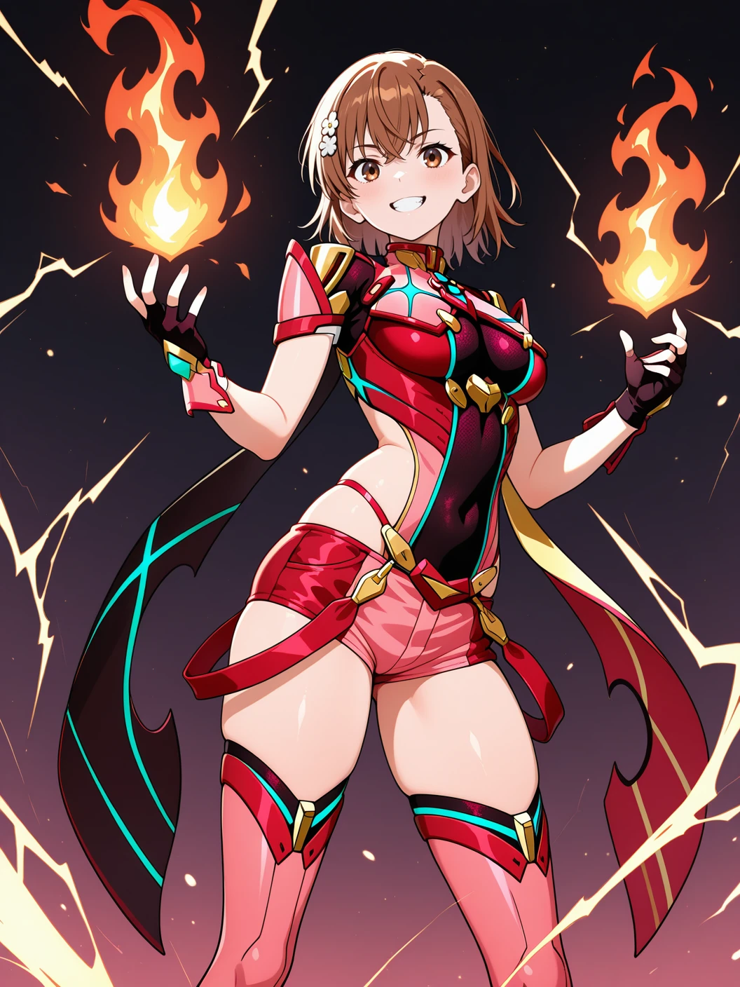 Pyra's cosplay outfits may have their depictions distorted due to the influence of the character wearing them. Please adjust by appropriately increasing the strength of the prompt for Pyra's outfit or decreasing the strength of the prompt related to the character wearing it.