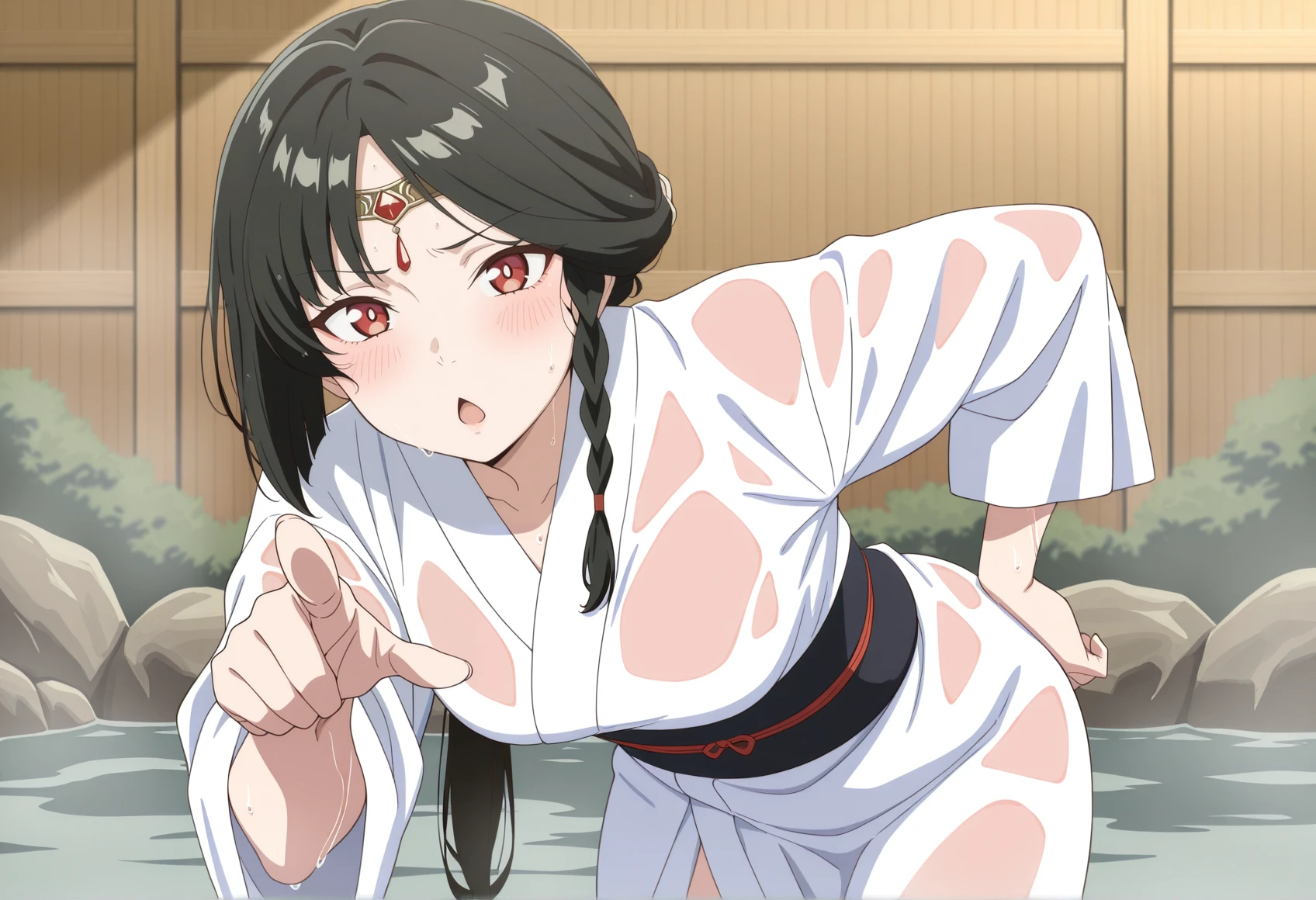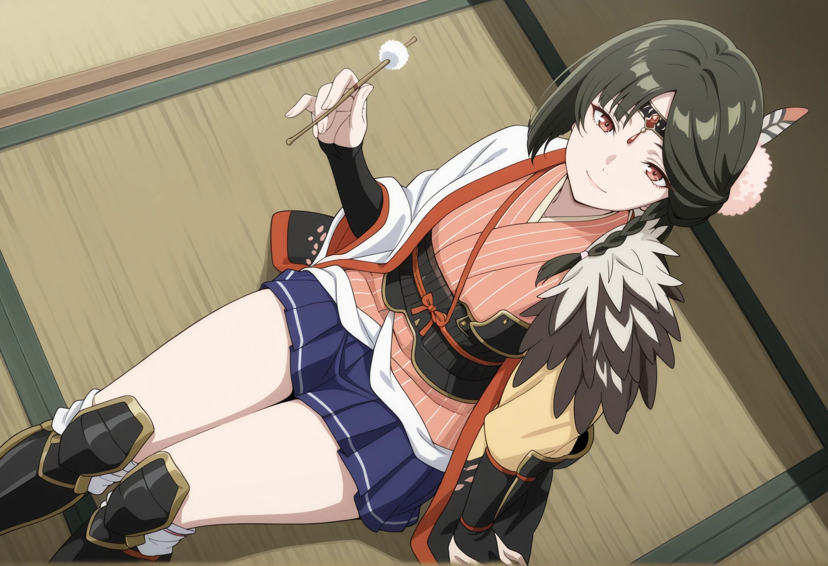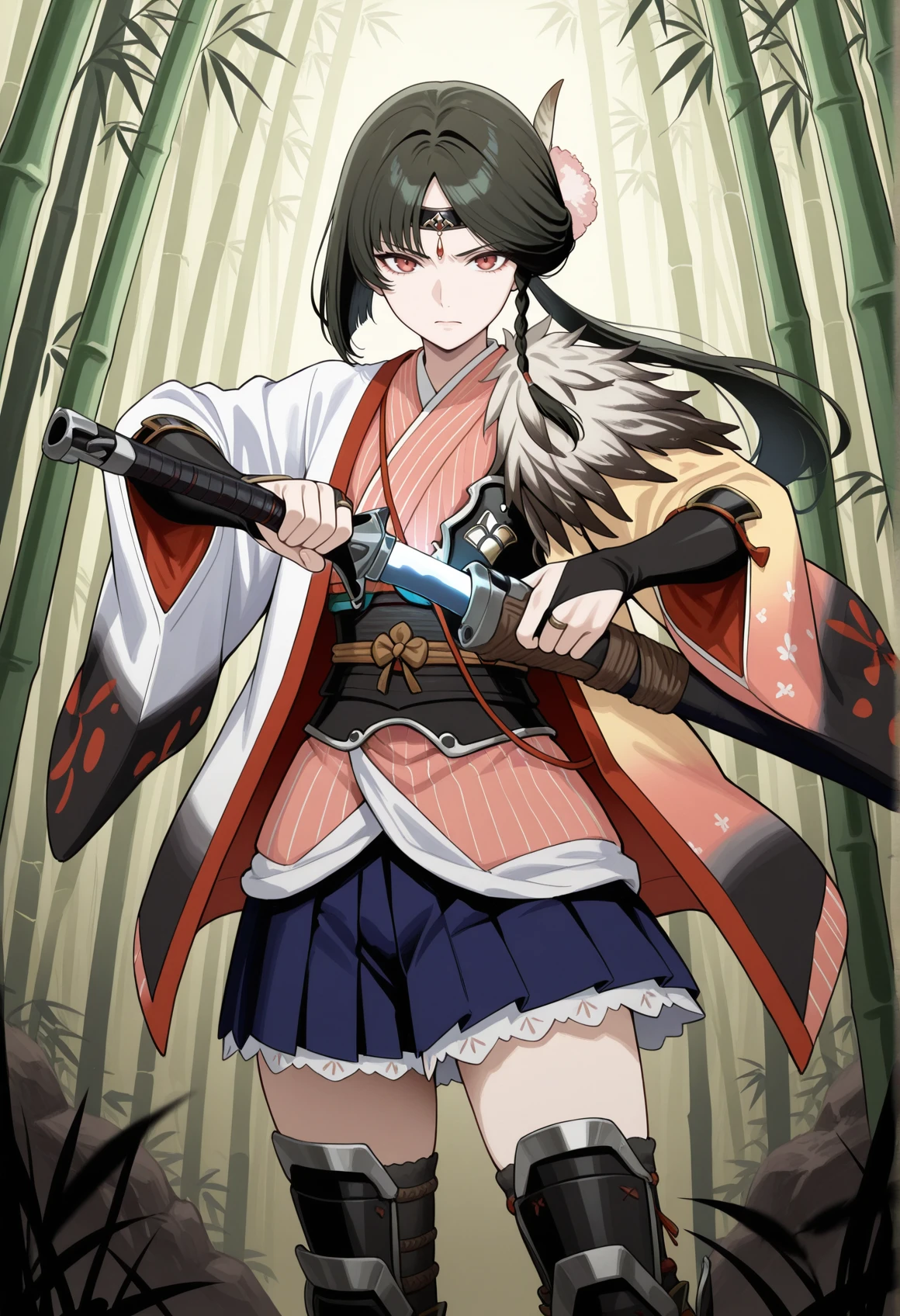 long hair, braid, low ponytail, red eyes, circlet, forehead jewel, japanese clothes, feather trim, pink kimono, white hakama, blue skirt, bridal gauntlets, armored boots