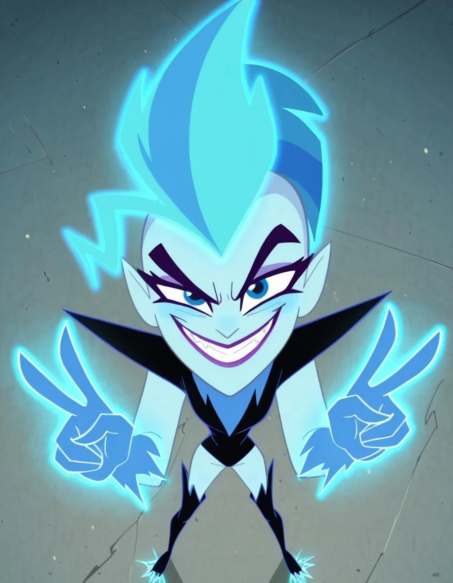 livewiredcshg, blue eyes, pointy ears, purple lips, blue hair, mohawk, streaked hair, blue skin, black bodysuit, spiked shoulder pads, blue elbow gloves, , black thigh-high boots, spiked soles, blue glowing aura