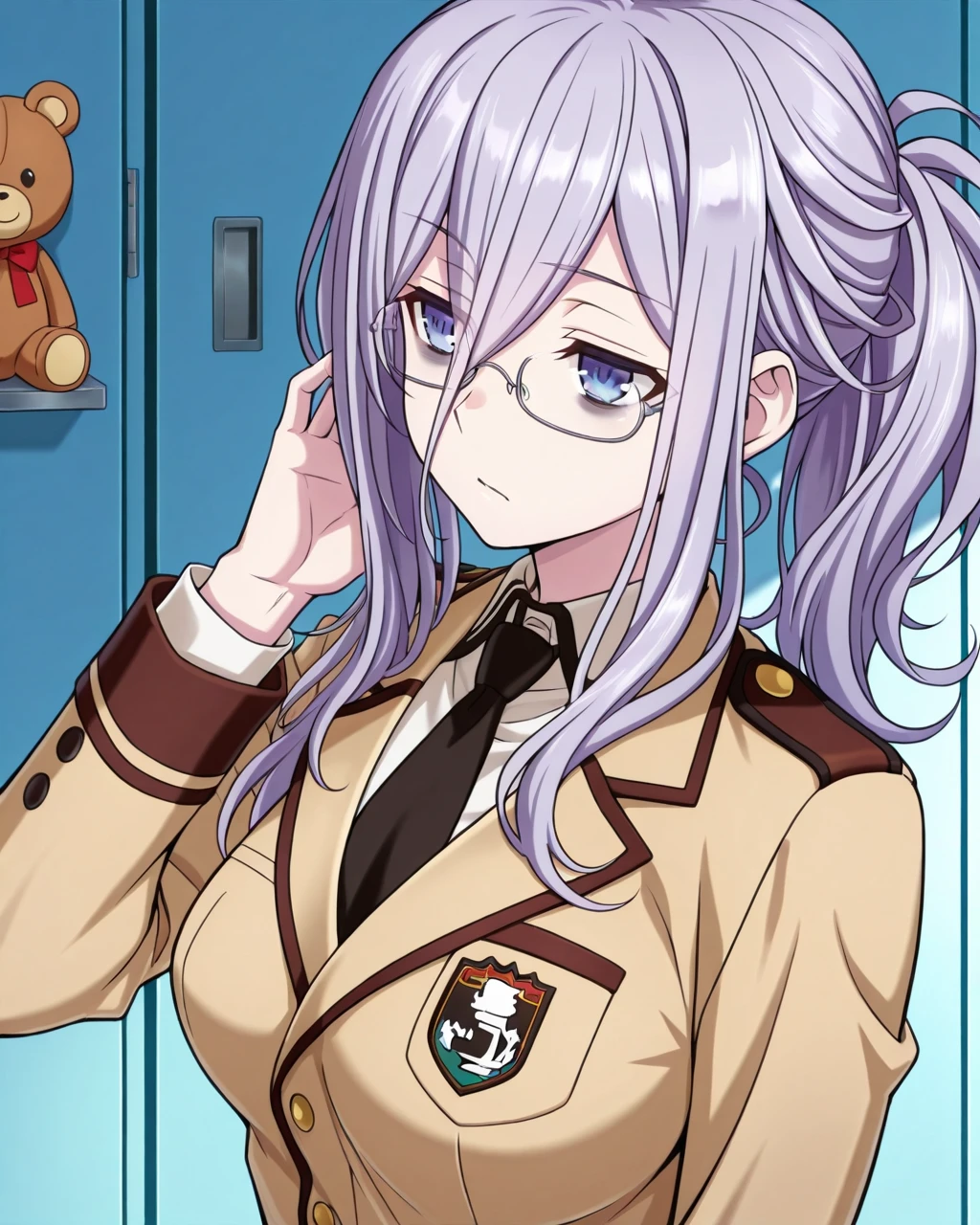 Murasame Reine, murasame, bags under eyes, light gray hair, blue-violet eyes, dark circles, ponytail, long hair, hair between eyes, medium breasts, glasses, side ponytail, 1girl, solo