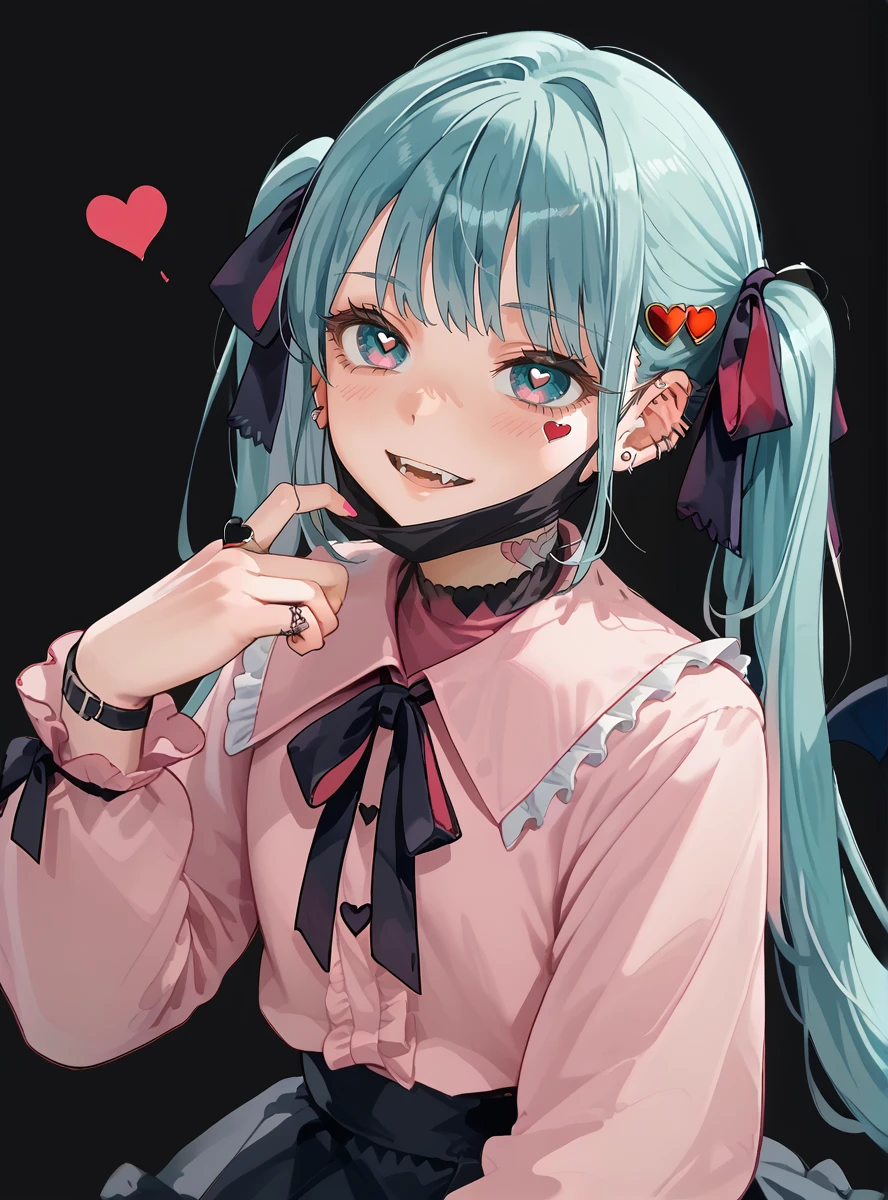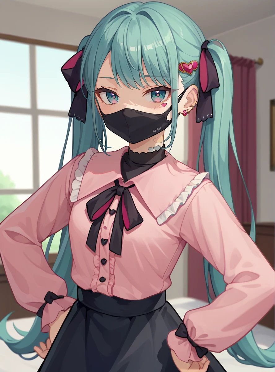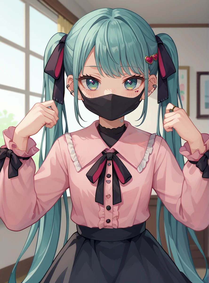 1girl, twintails, solo, shirt, mask, skirt, (mouth mask), long hair, jewelry, heart hair ornament, ring, long sleeves, pink shirt bat_Wings
