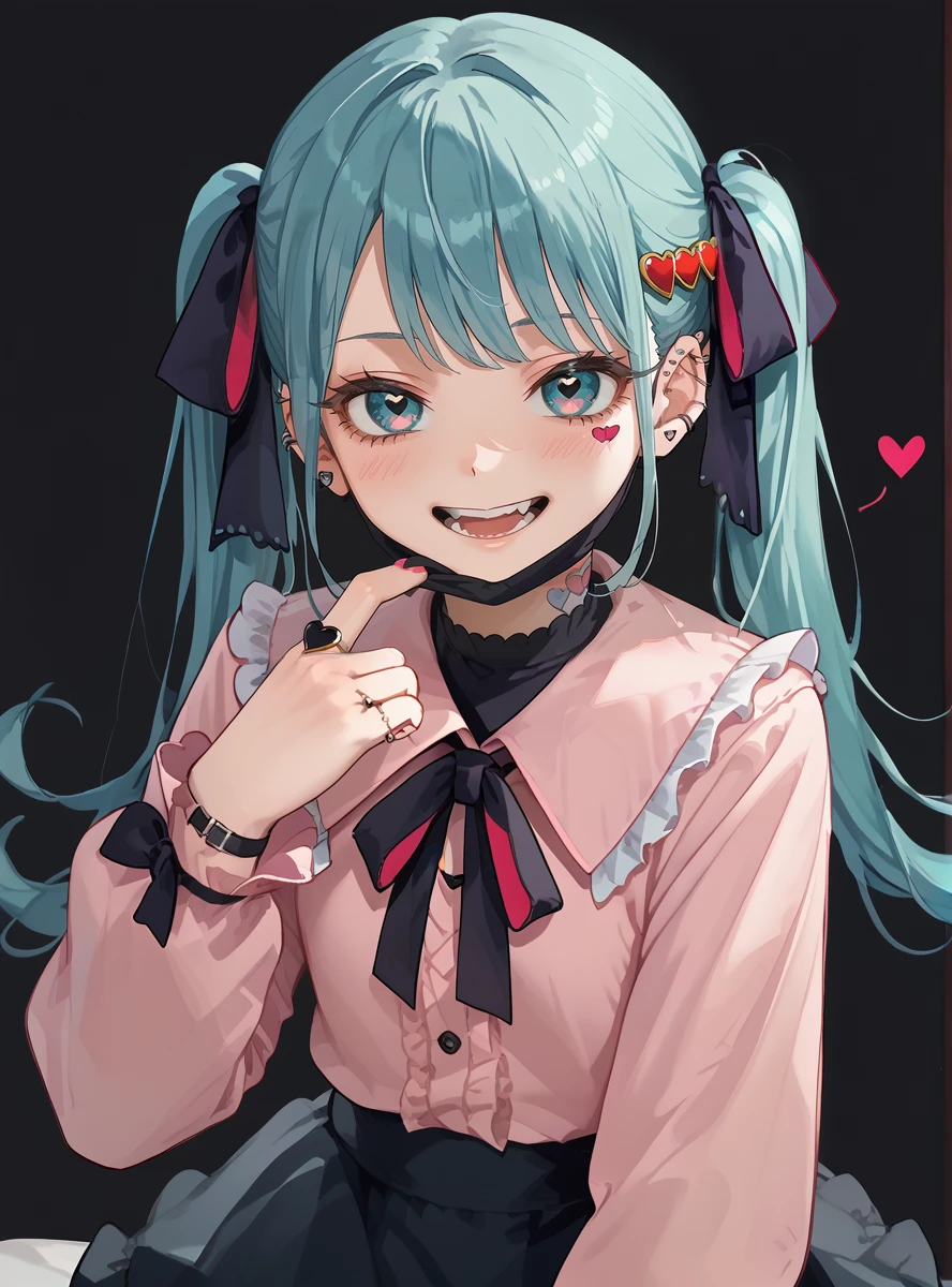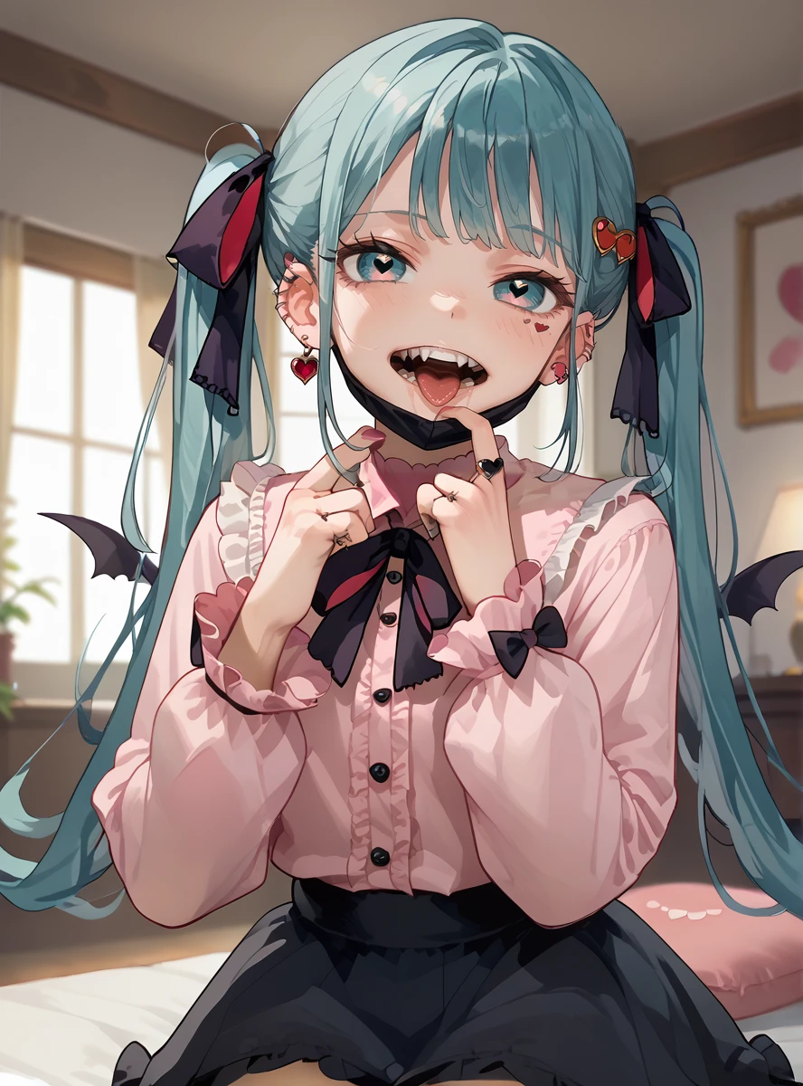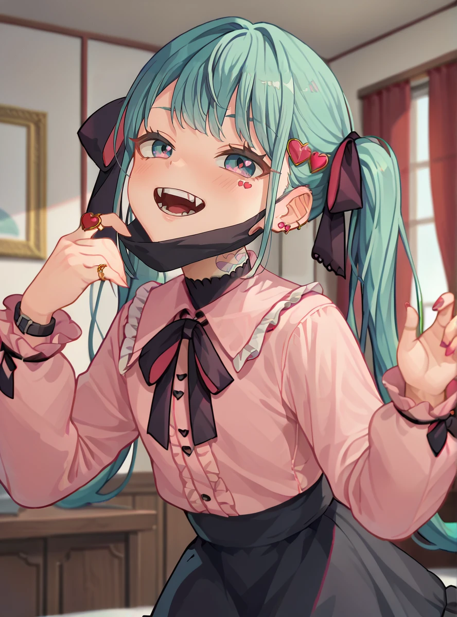 1girl, twintails, solo, shirt, mask, skirt, (mouth mask), long hair, jewelry, heart hair ornament, ring, long sleeves, pink shirt bat_Wings