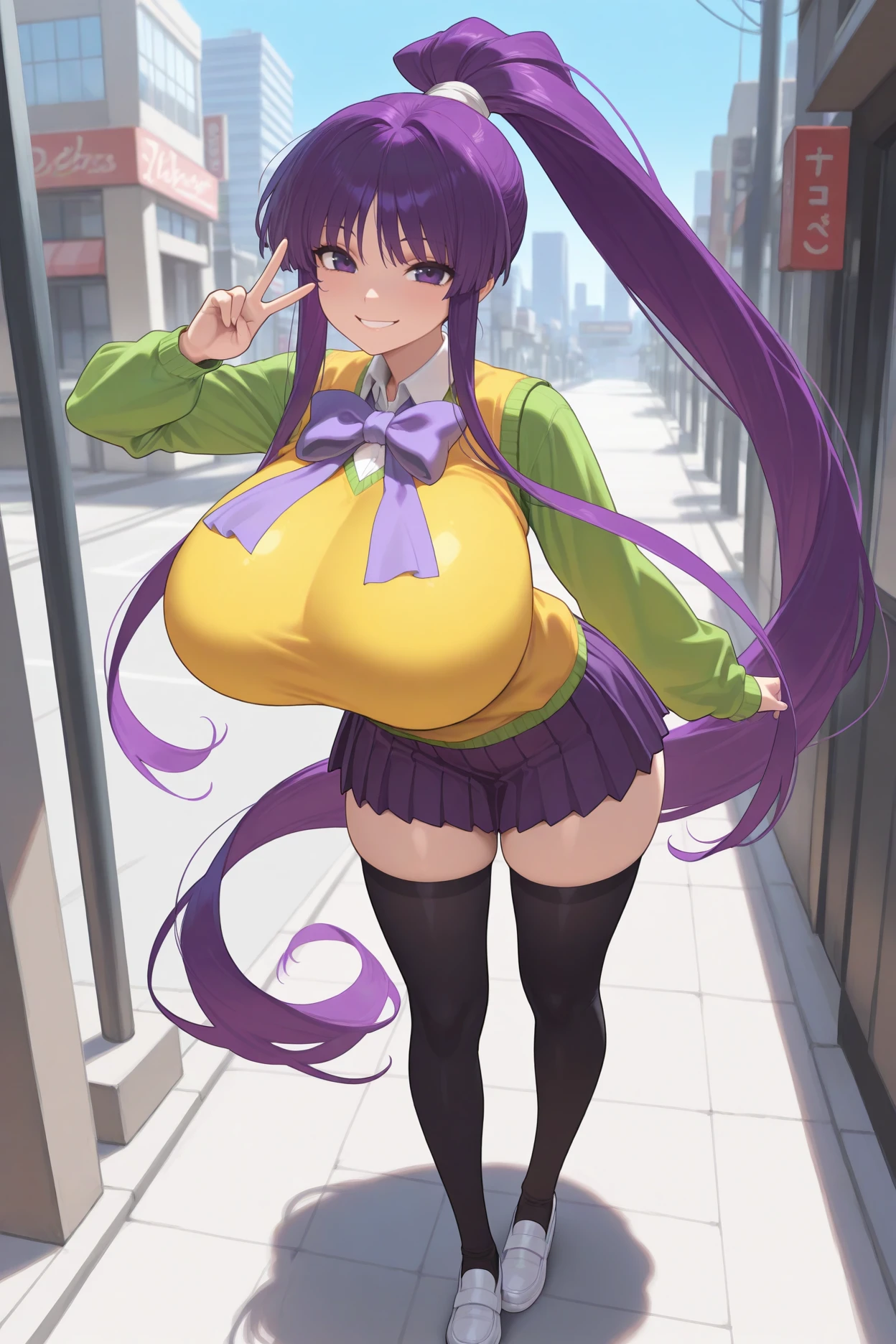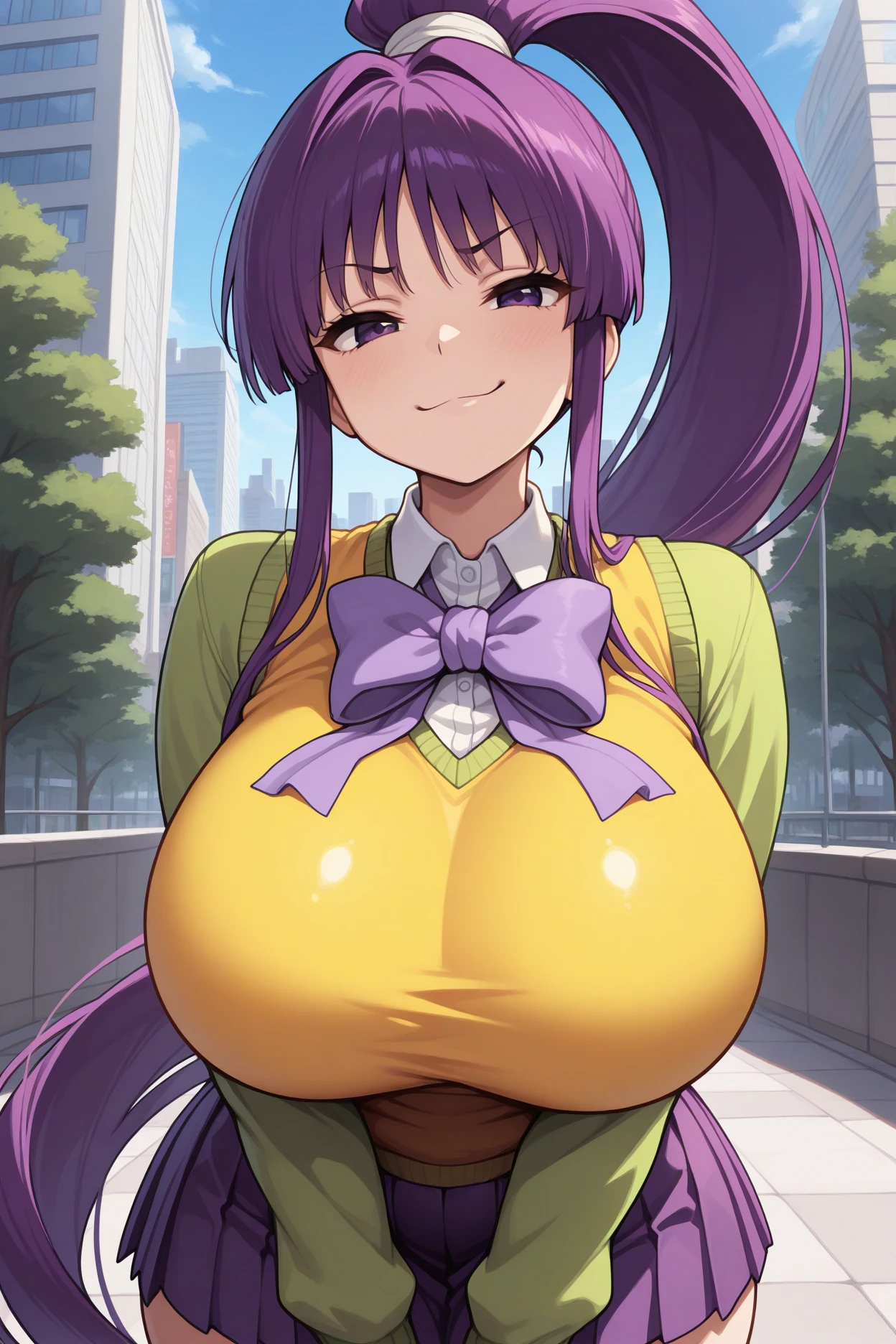 Add "purple bowtie, yellow sweater vest, green shirt, long sleeves, green sleeves, purple skirt, pleated skirt, black thighhighs" for her uniform.