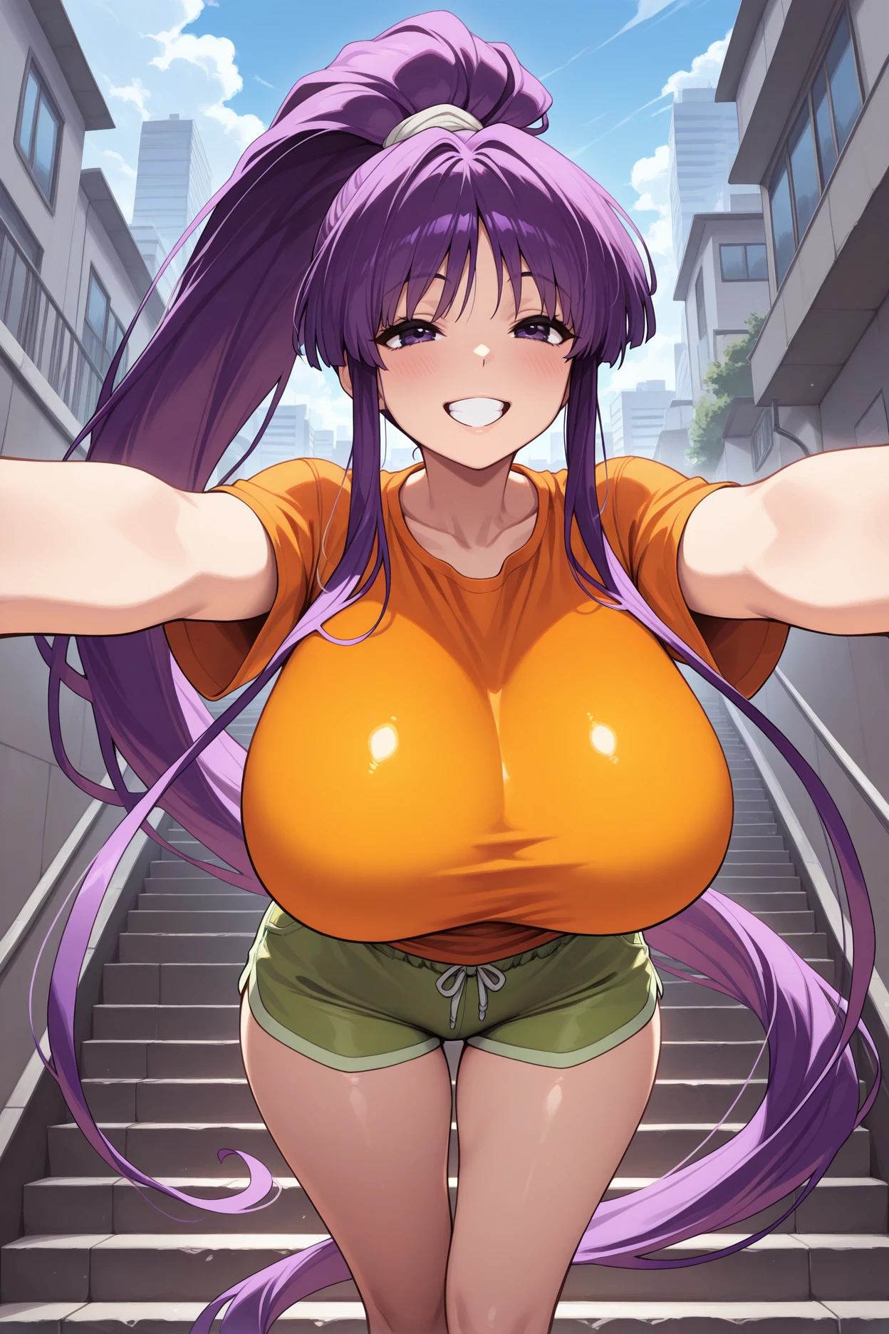 Trigger word is "kmisono" and "purple hair, very long hair, high ponytail, purple eyes" is required.