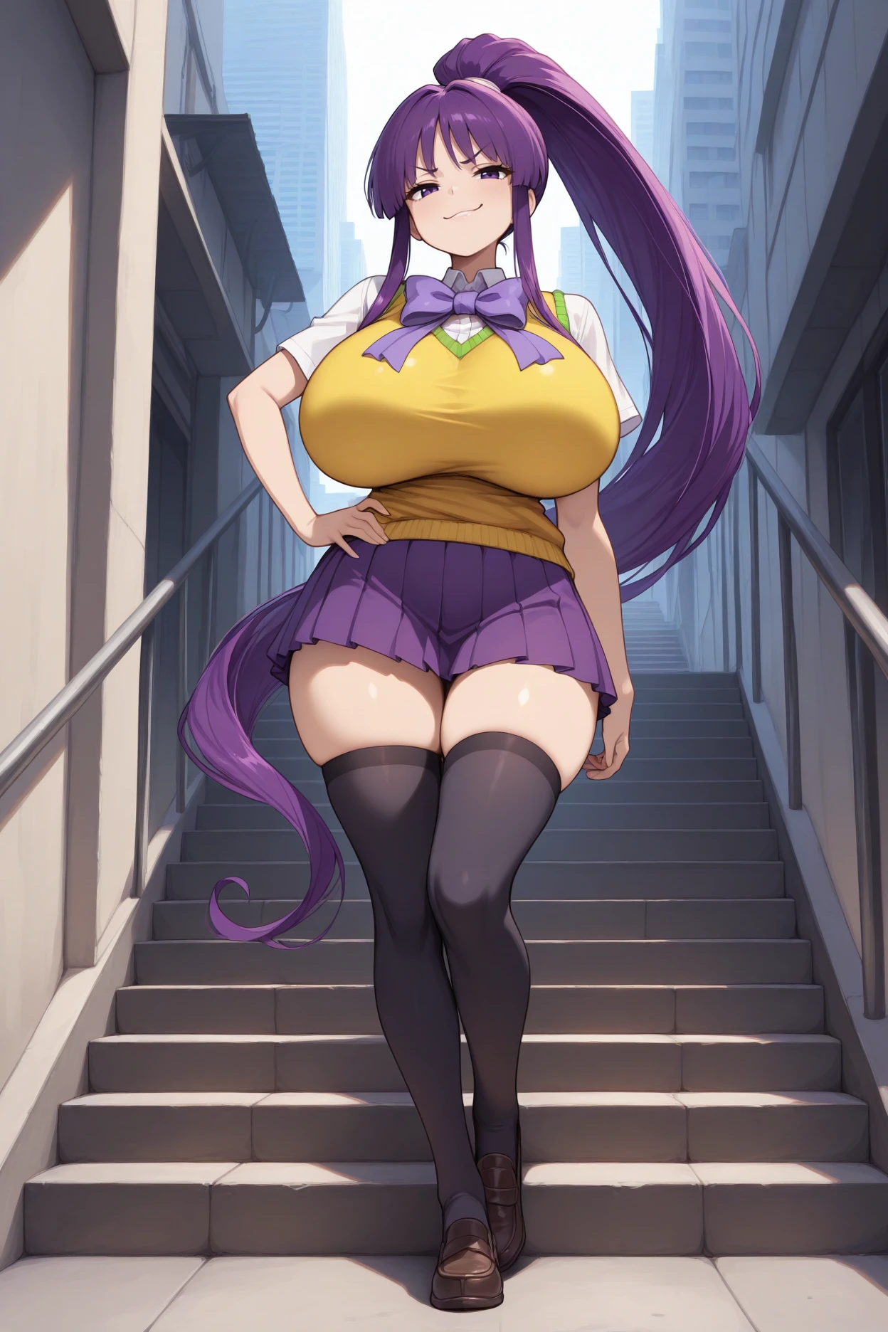 Add "purple bowtie, yellow sweater vest, white shirt, short sleeves, purple skirt, pleated skirt, black thighhighs" for her alternate "summer" uniform.