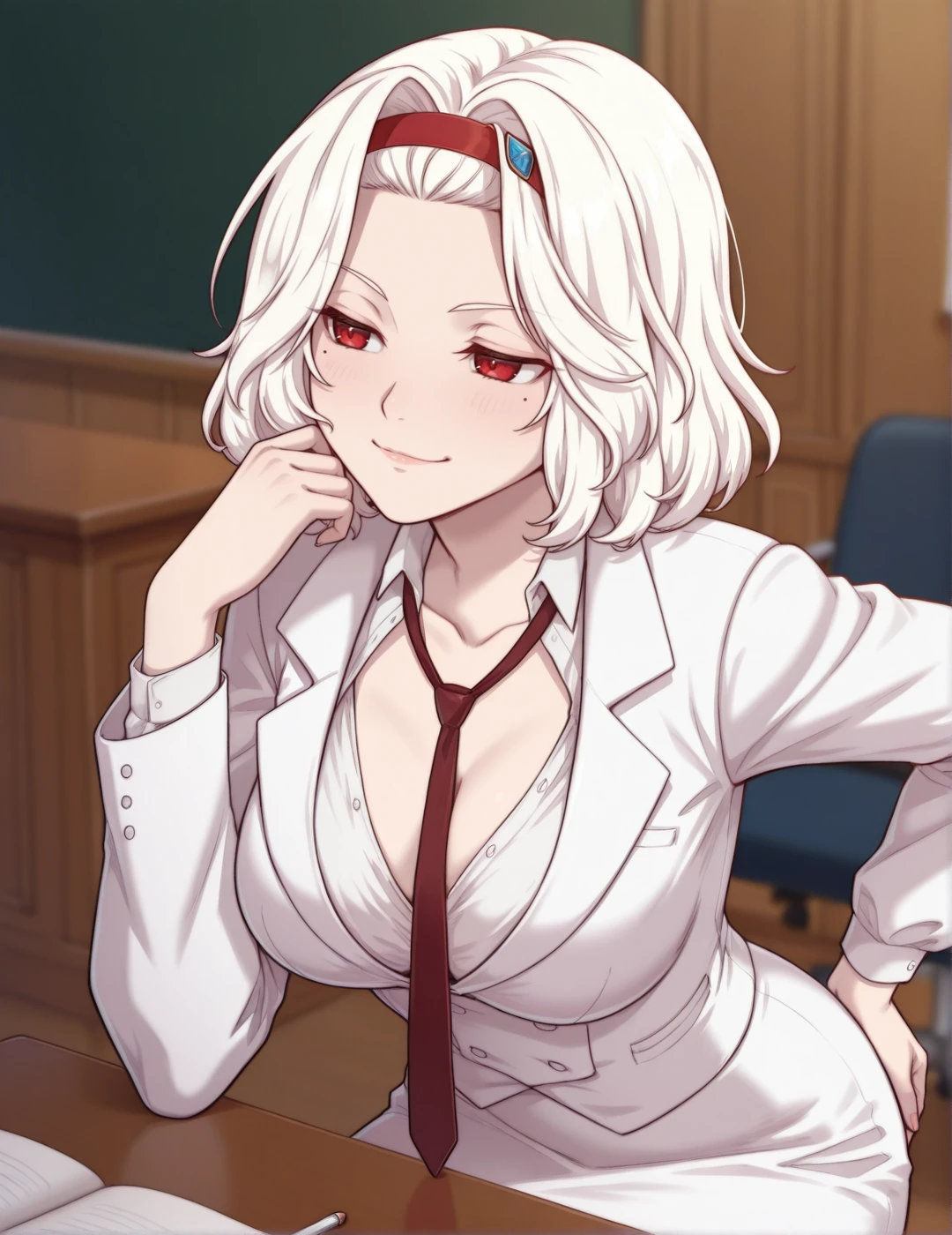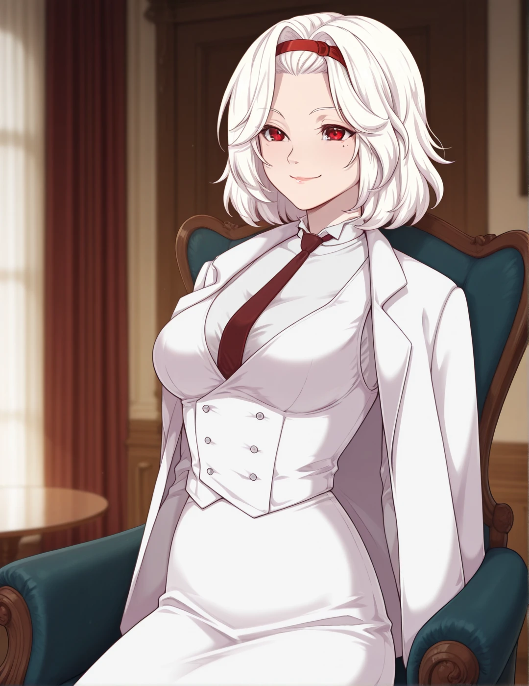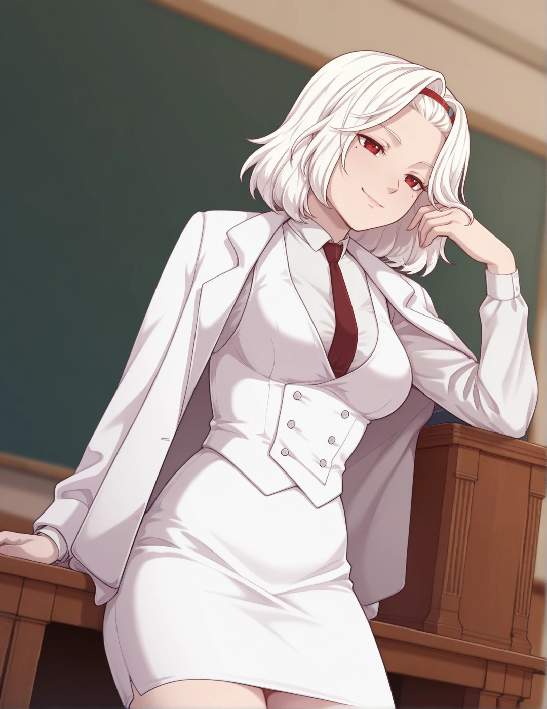 3)katarina_common_outfit, red hairband,white pencil skirt, necklace,necktie,white blazer,short hair.