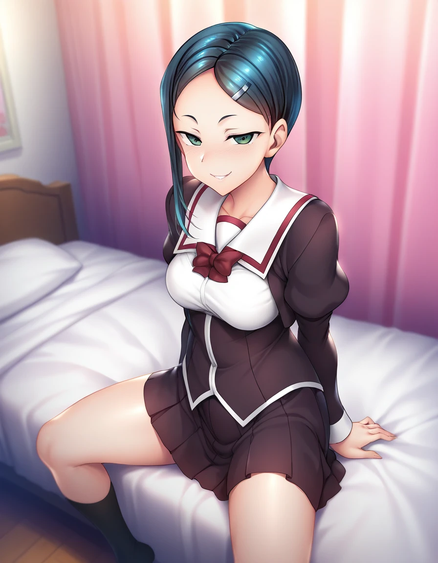 Natsuki Fujii: natsuki, black hair, green eyes, bang, school uniform,