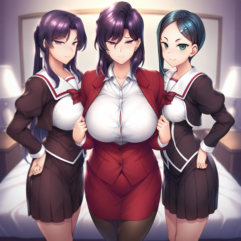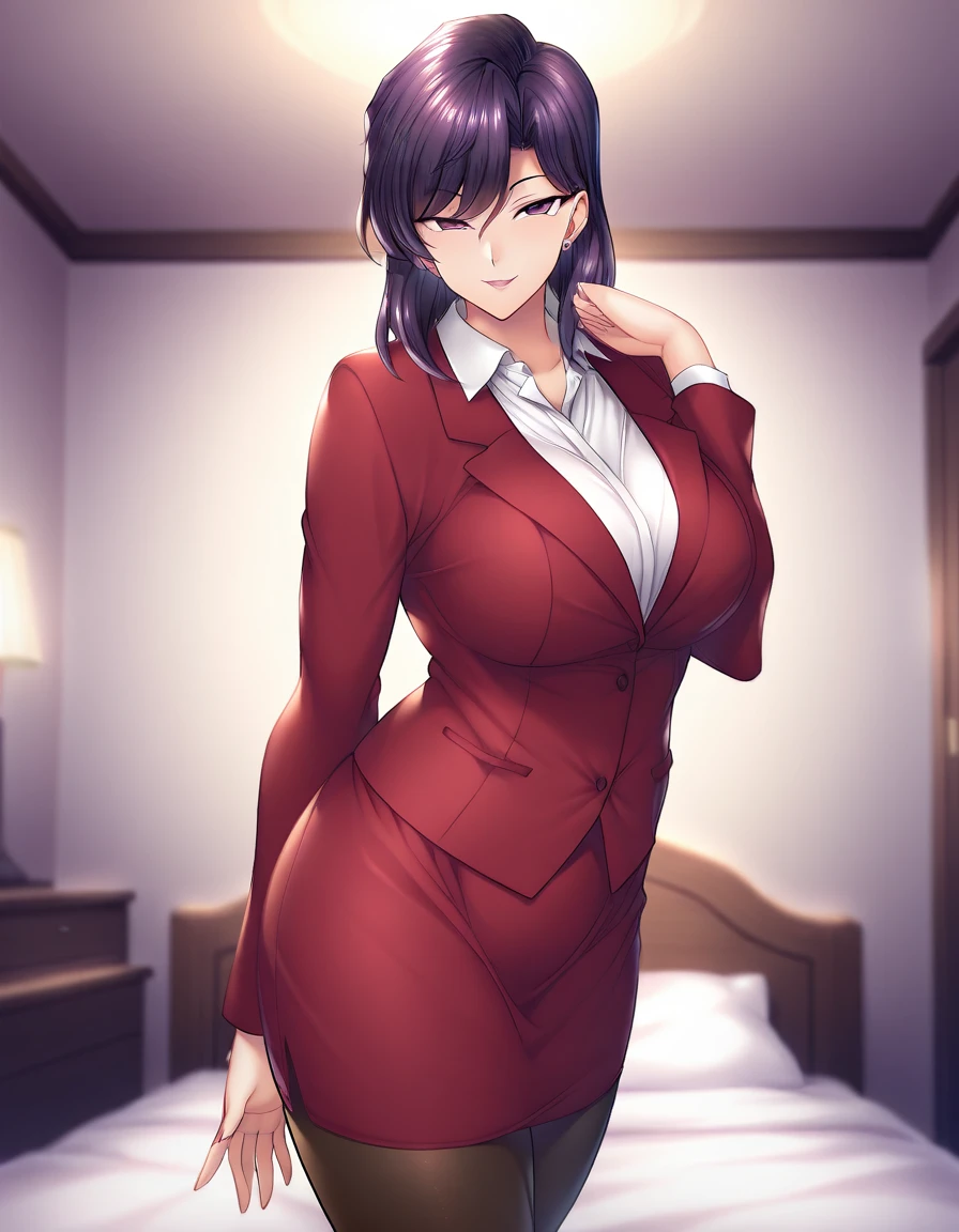 Suzuka Himemiya; suzuka, purple hair, purple eyes, medium hair, red suit jacket, white shirt, red pencil skirt, pantyhose,