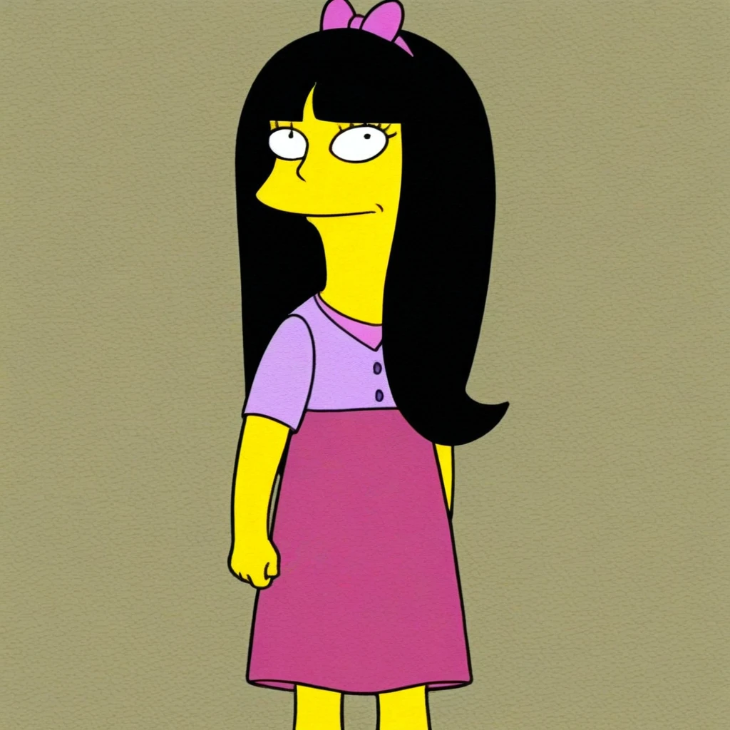 jessica_lovegood, black hair, long hair, yellow skin, hair bow, dress
