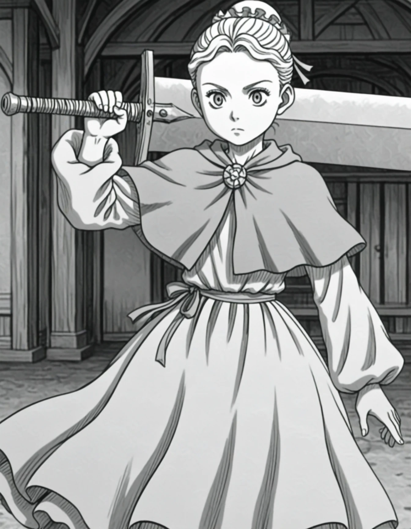 1girl,bun cover,single hair bun,blonde hair,long sleeves,capelet,dress