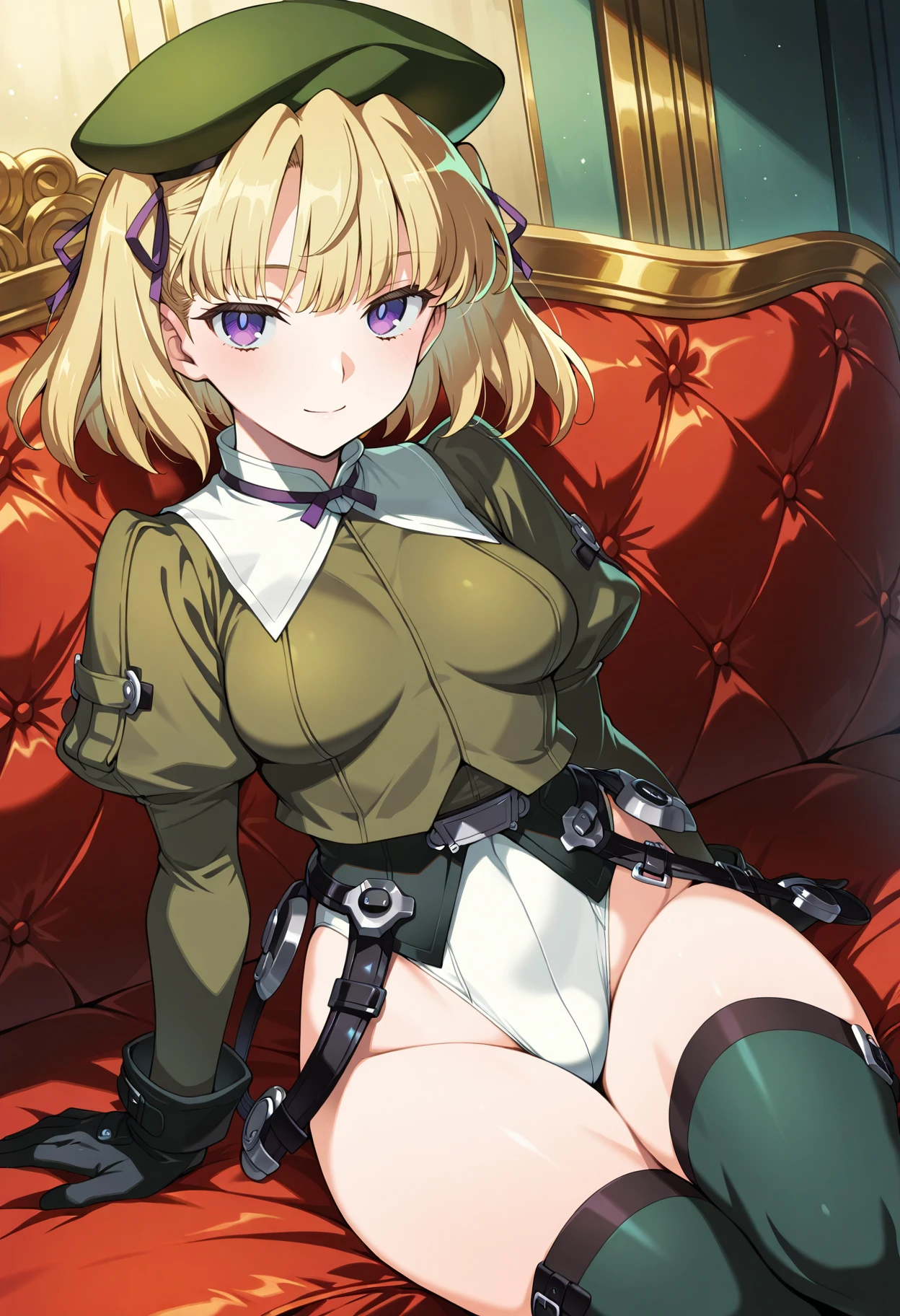 Base: uruza_p, 1girl, retro artstyle, solo, blonde hair, short hair, two side up, hair ribbon, hair between eyes, purple eyes ,green beret, uruza green shirt, white highleg leotard, juliet sleeves, long sleeves, black gloves, battle belt, medium breasts, thighhighs,