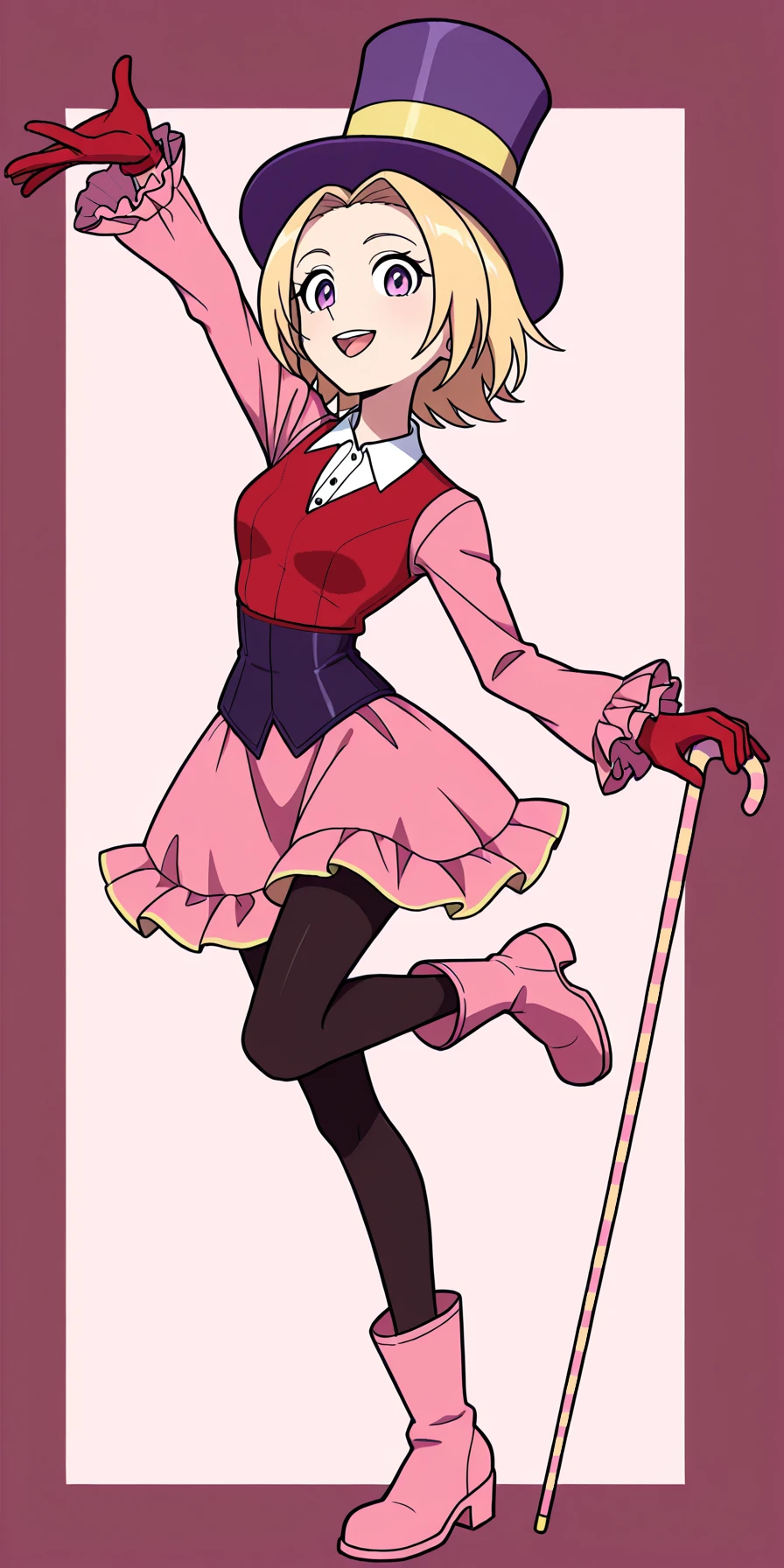 Clothes: white collared shirt, pink sleeves, red vest, purple corset, red gloves, pink skirt, yellow trimmed skirt, pantyhose, pink boots,